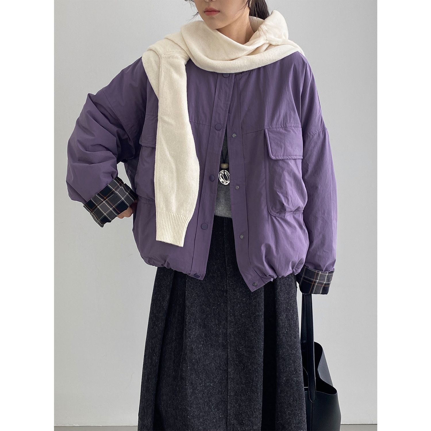 那末日系复古格子撞色棉服女设计感大口袋宽松百搭保暖棉衣2629
