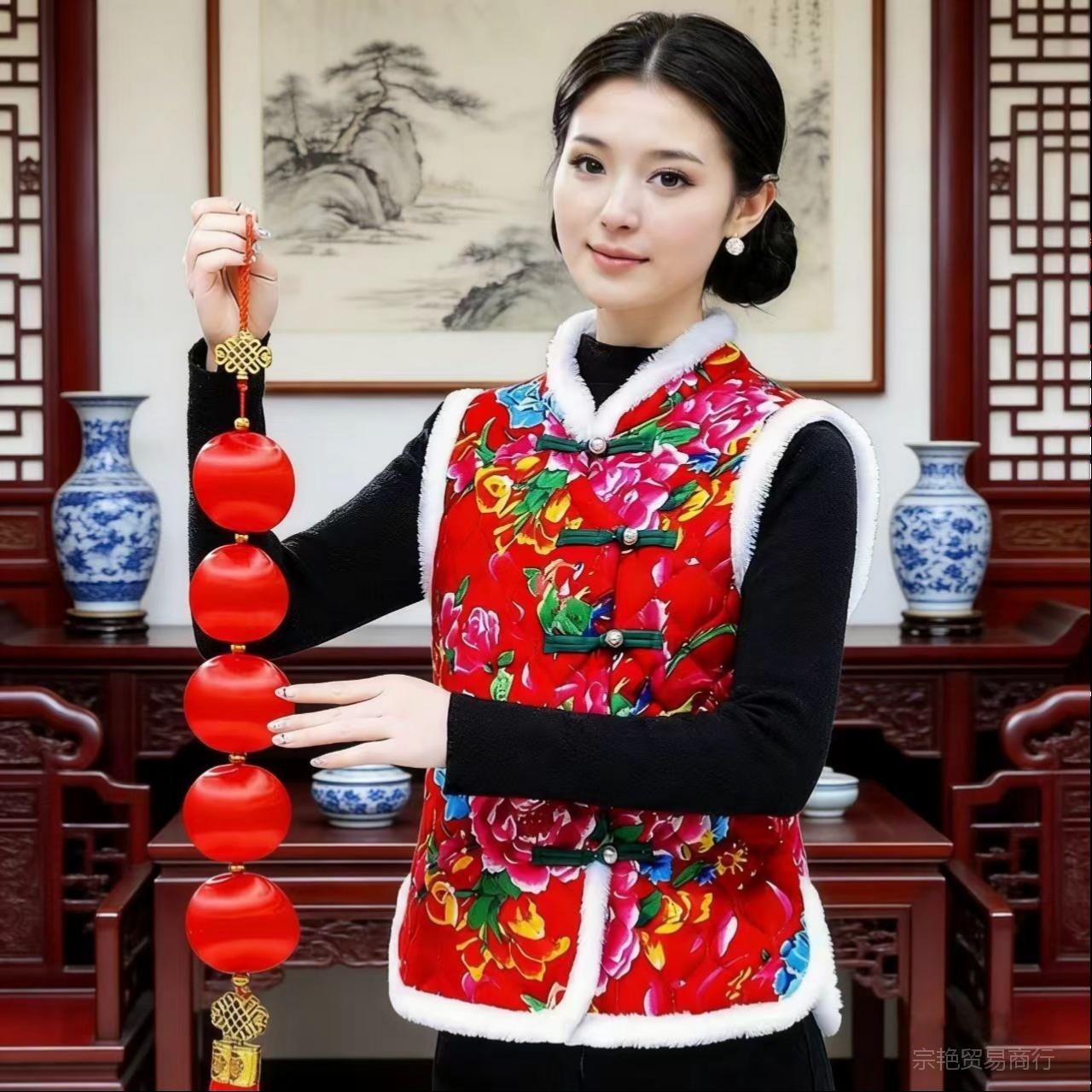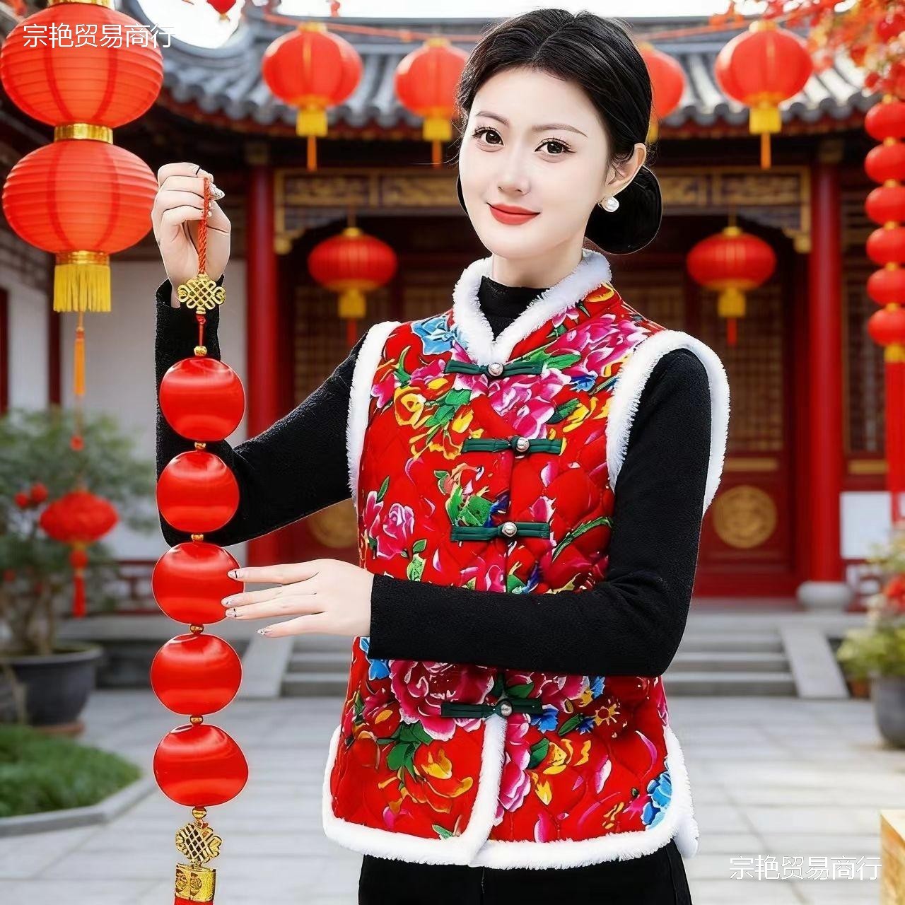 馬甲砕花東北盤ボタンネット赤大花袖なし民族風復古カン肩母装ベルベット上着冬