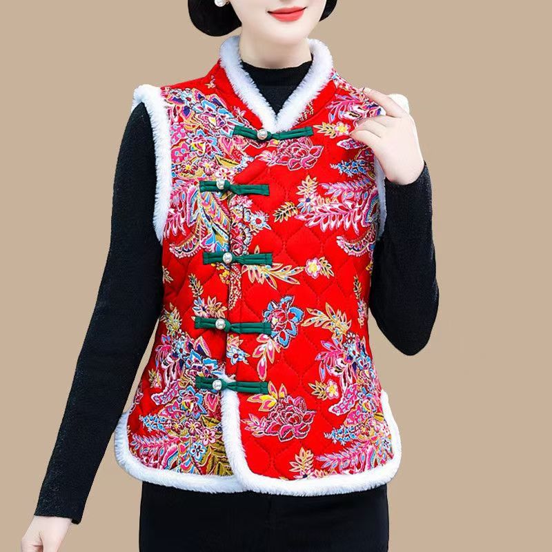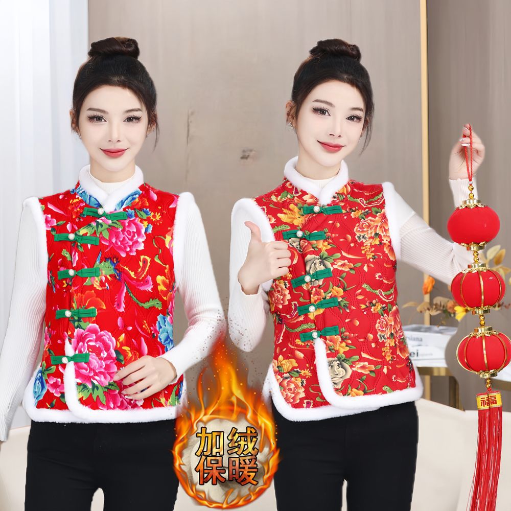 东北大花棉袄马甲民族复古坎肩女装妈妈盘扣加厚中国加绒保暖唐装