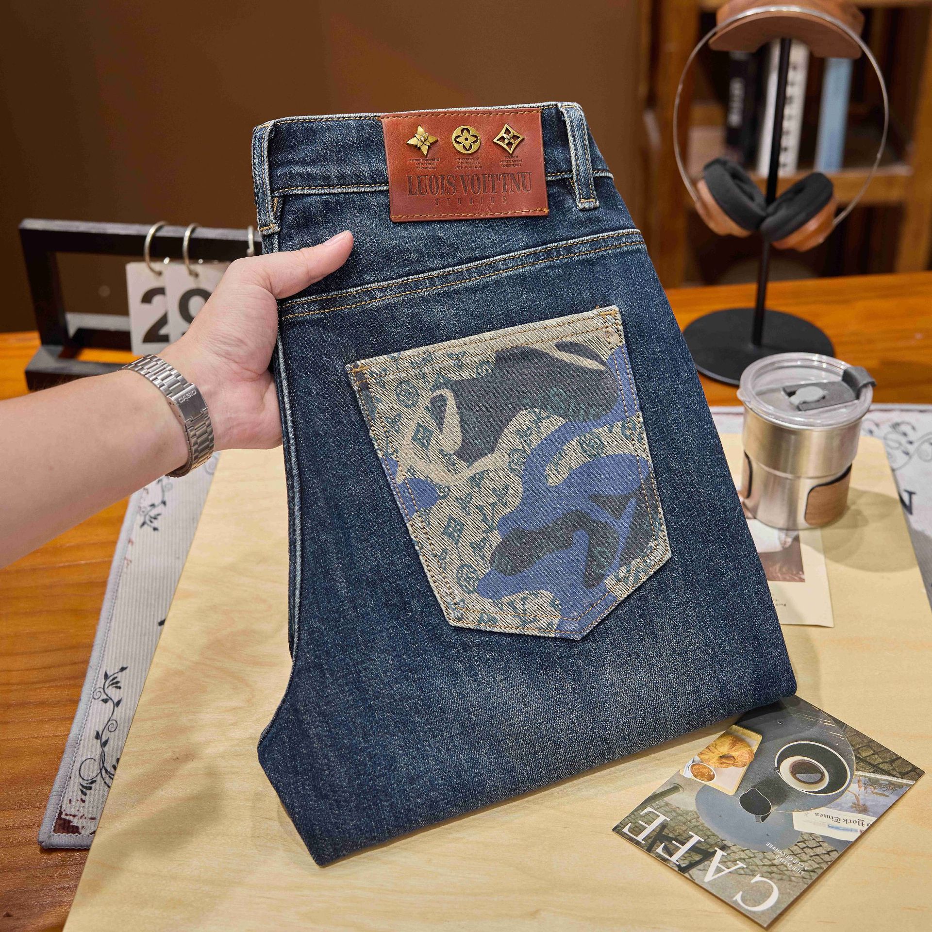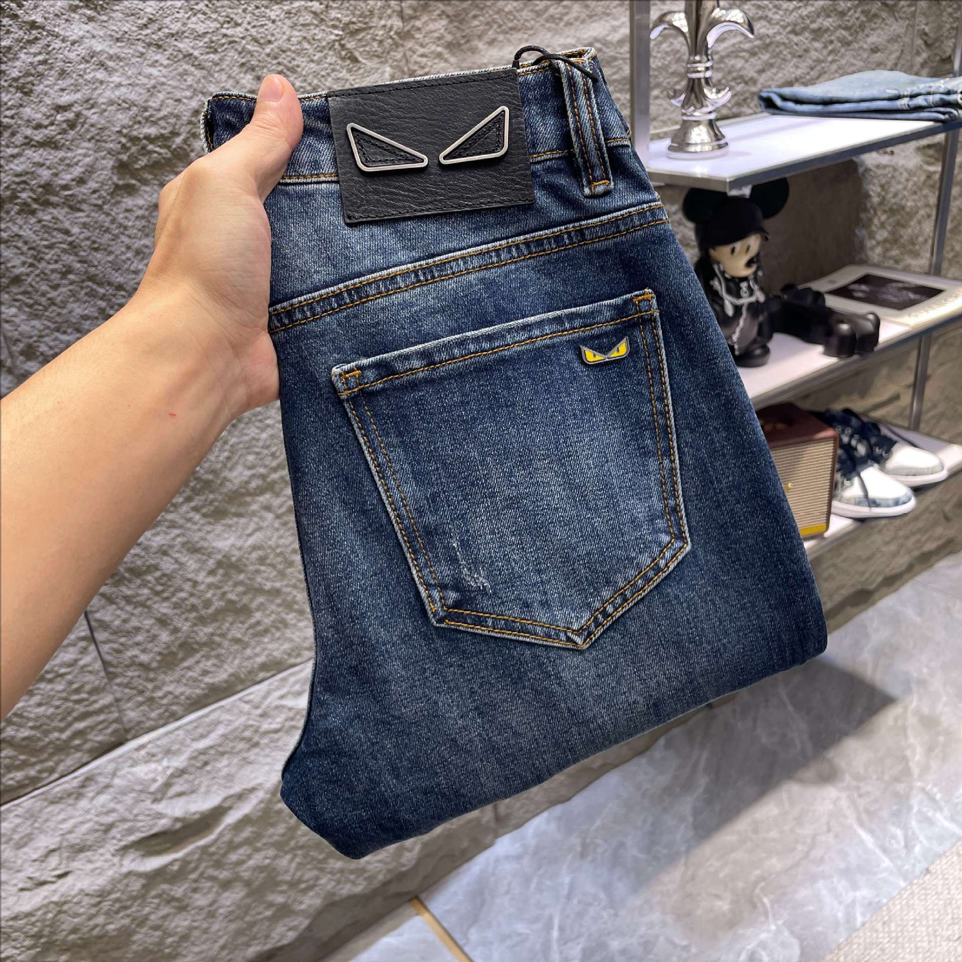 香港のトレンドブランド、高級プリントデニムパンツ、メンズ春秋新作、若者向けファッショナブルでスタイリッシュなトレンド、スリムフィットの細身ロングパンツ
