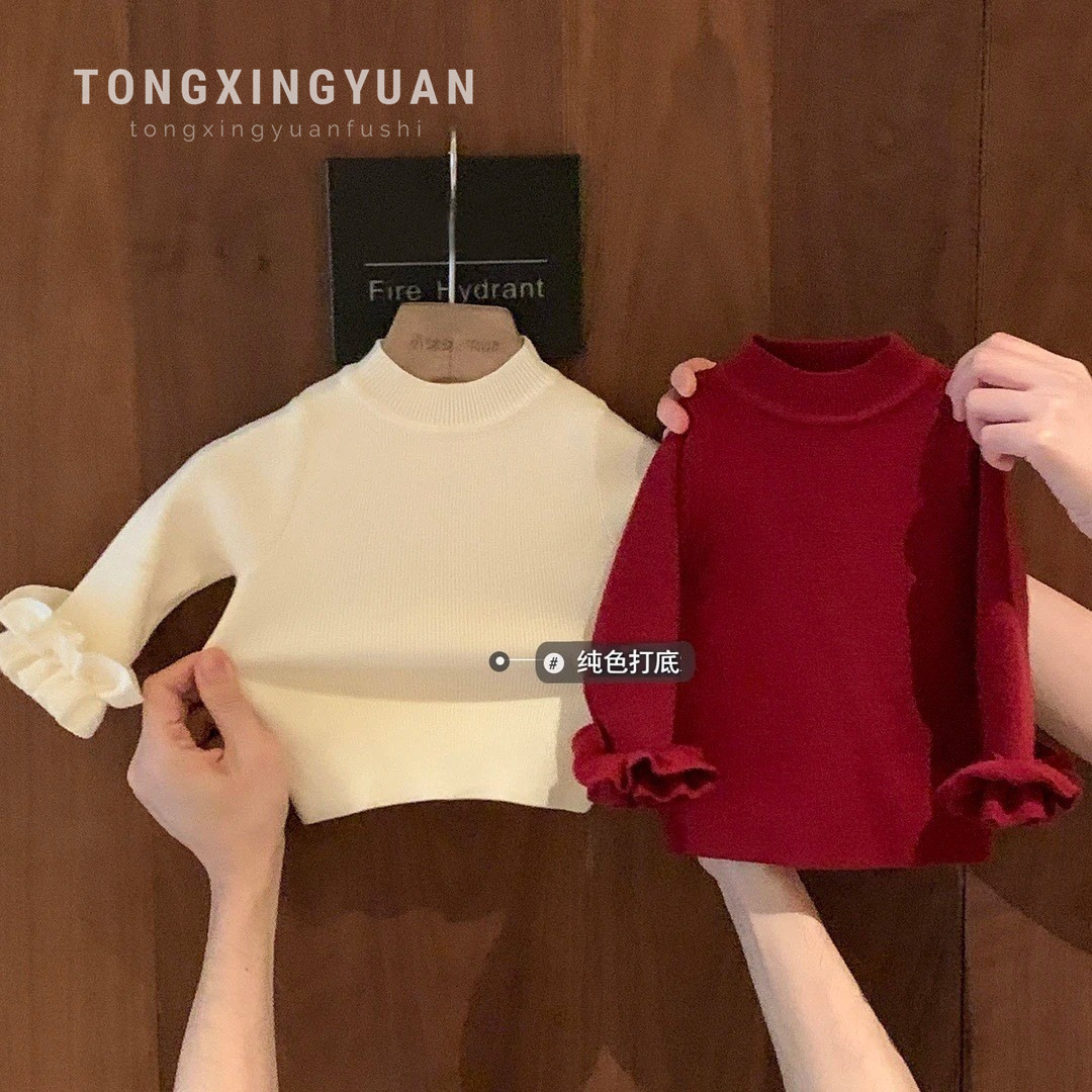【秋冬新作】女の子用新作ベビートップス、女の子用プリンセス風フリル付きインナーシャツ、子供用ニットウェア