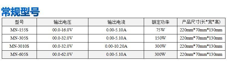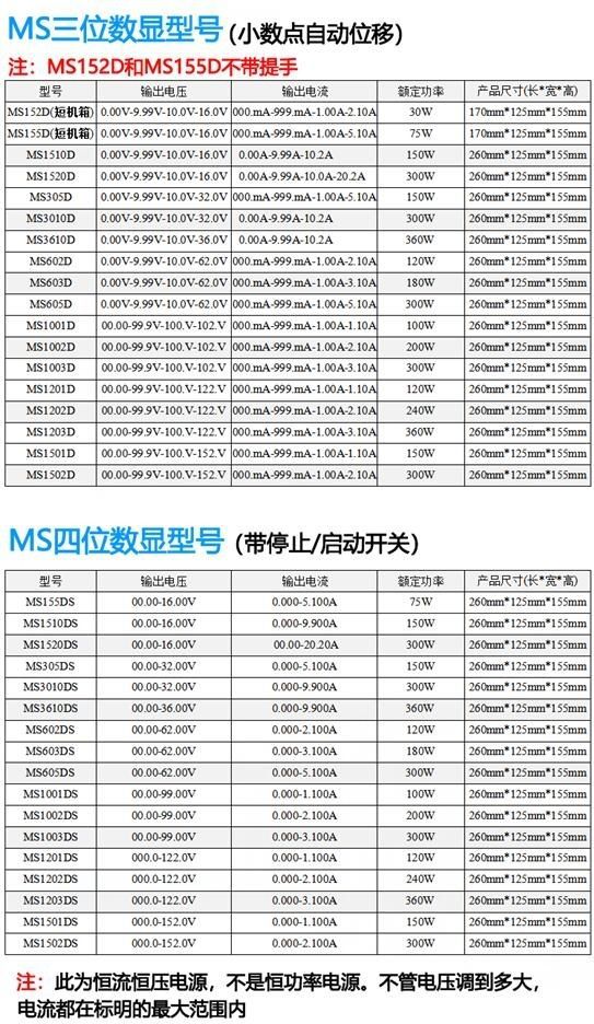 MN-152D(15V2A)迷你型,MS152D(15V2A)短机箱,MN-305S(30V5A)带功率显示,MS155D(15V5A)短机箱,MN-3010S(30V10A)带功率显示,MS305D(30V5A)短机箱,MN-605S(60V5A)带功率显示,MS305D-S2(30V5A)三位数显,MS305DS(30V5A)四位数显,MS155C(15V5A编码器精准调节,MS305C(30V5A编码器精准调节,MN-305C(30V5A)带功率显示,MS306C(30V6A编码器调精准节,MS3010D-S1(30V10A短机箱,MS365C(36V5A编码器精准调节,MS3010D(30V10A)三位数显,MS3010DS(30V10A)四位数显,MS1510C(15V10A编码器精准调节,MS605D(60V5A)三位数显,MS605DS(60V5A)四位数显,MS3010C(30V10A编码器精准调节,MN-3010C(30V10A)带功率显示,MS1520DS(15V20A)四位数显,MN-605C(60V5A)带功率显示,MS3610C(36V10A编码器精准调节,MS605C(60V5A编码器精准调节,MS1201C(120V1A编码器精准调节,MS1520C (15V20A编码器精准调节,MS606C(60V6A编码器精准调节,MS1003C(100V3A编码器精准调节,MS1202C(120V2A编码器精准调节,MS1203C(120V3A编码器精准调节,MS1502C(150V2A编码器精准调节,MS3020C(30V20A编码器精准调节,MP1530D(15V30A)大功率,MP3020D(30V20A)大功率,MS6010C(60V10A编码器精准调节,MS2002C(200V2A编码器精准调节,MS1006C(100V6A编码器精准调节,MP6010D(60V10A)大功率,MP1550D(15V50A)大功率,MP1560D(15V60A)大功率,MP3030D(30V30A)大功率,MP1005D(100V5A)大功率