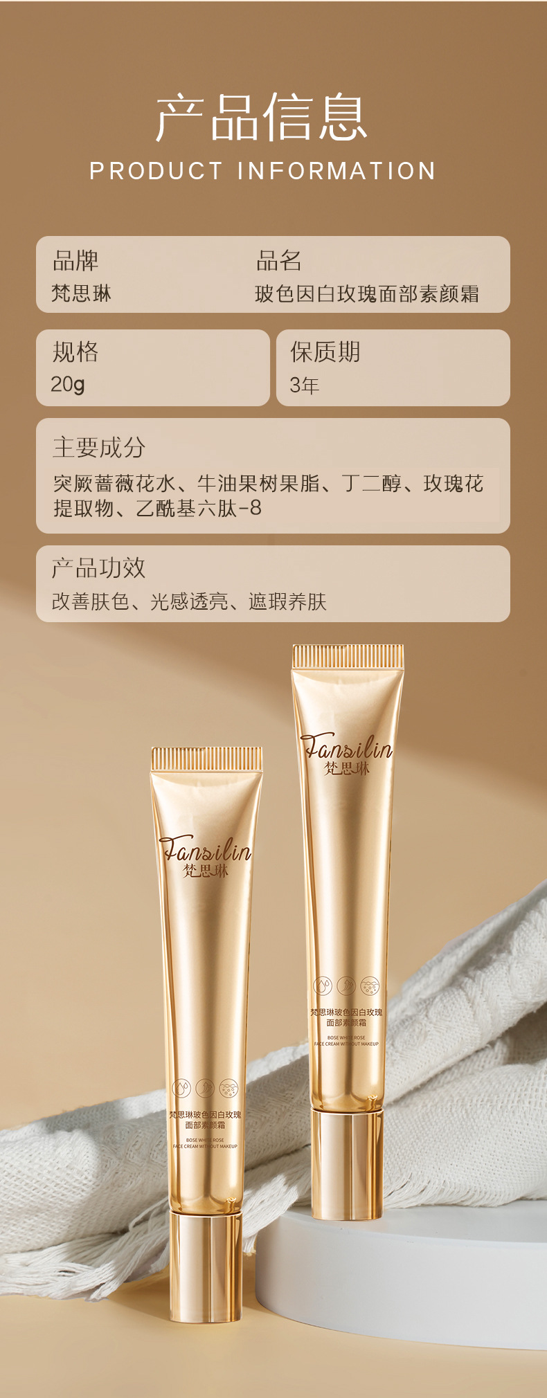 产品名称 Fansilin梵思琳玻色因白玫瑰面部素颜霜