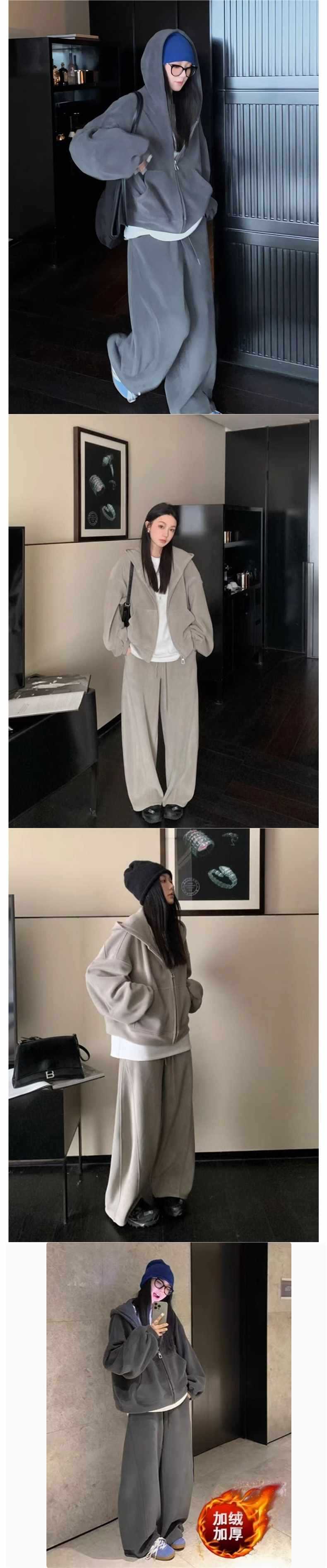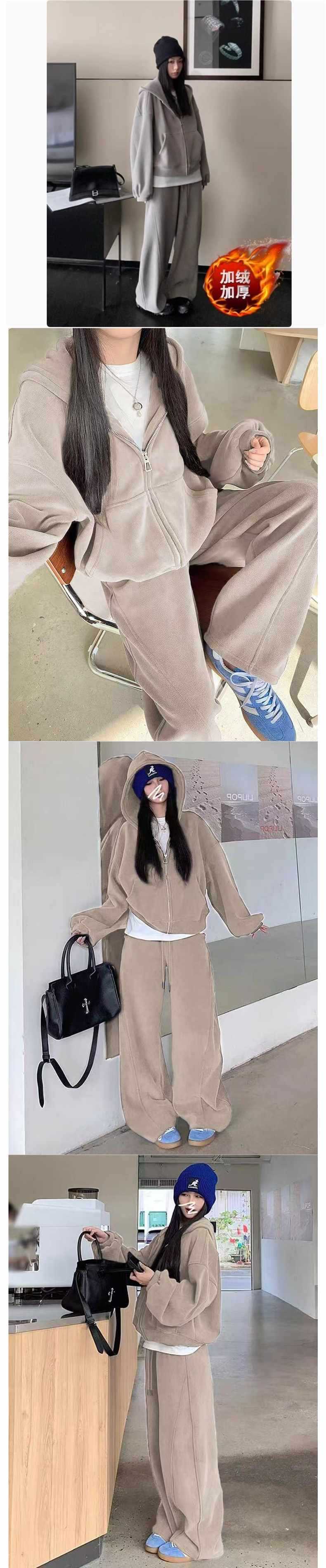 秋冬季韩版保暖羊羔绒拉链加厚宽松卫衣+松紧腰束脚休闲裤套装女