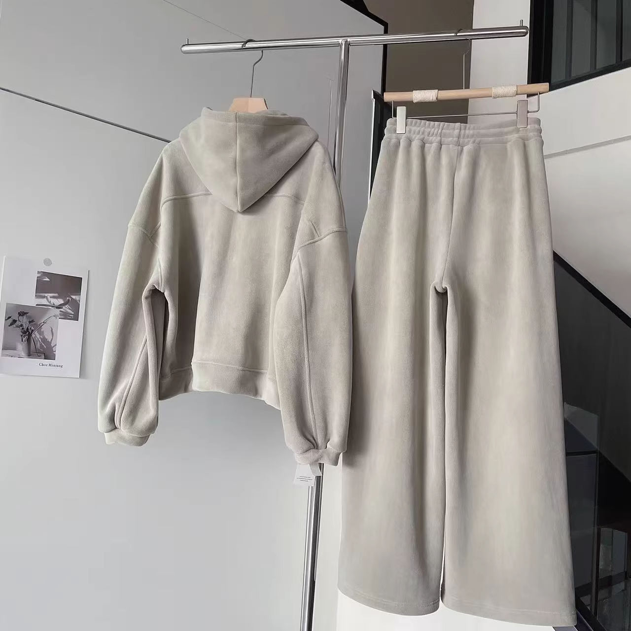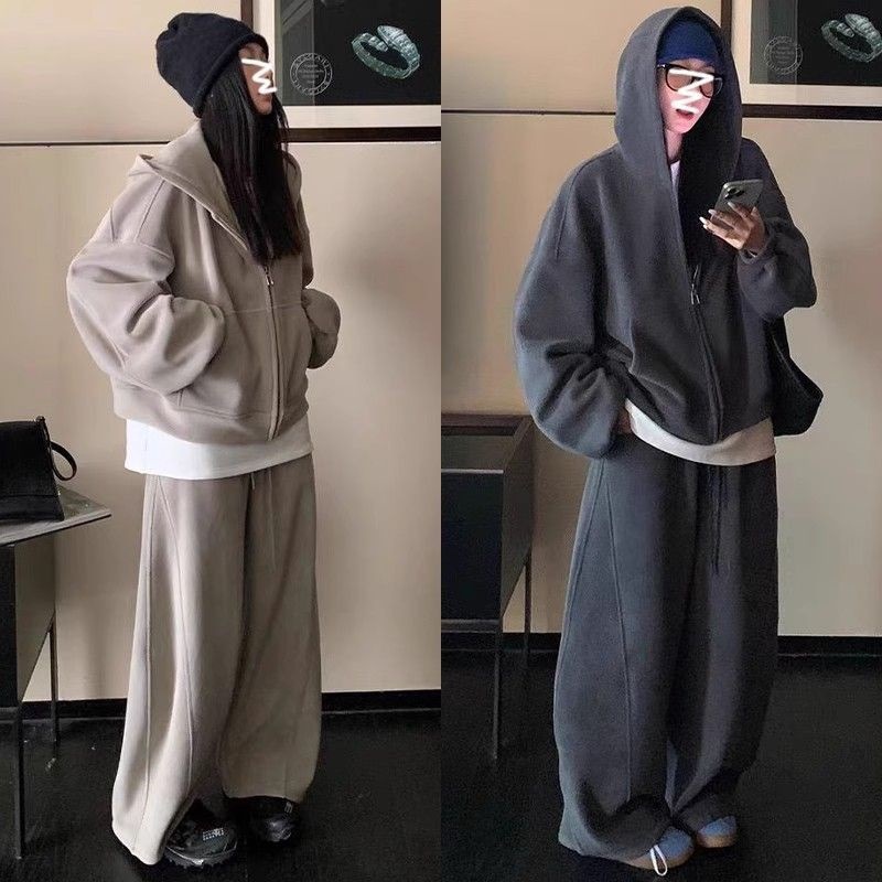 美式时尚套装女2025冬季加厚慵懒风休闲宽松连帽卫衣阔腿裤两件套