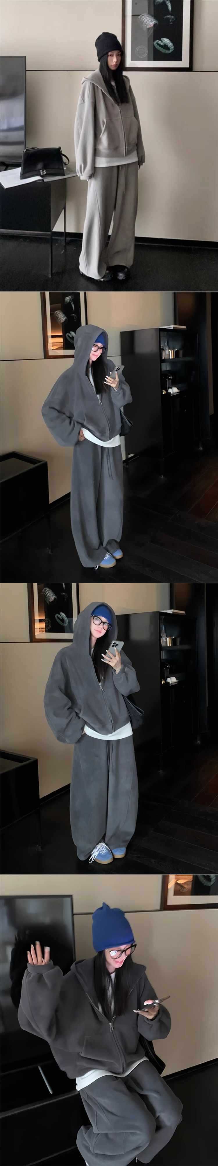 美式慵懒风灰色加绒卫衣套装加厚双面奥粒绒连帽oversize宽松休闲