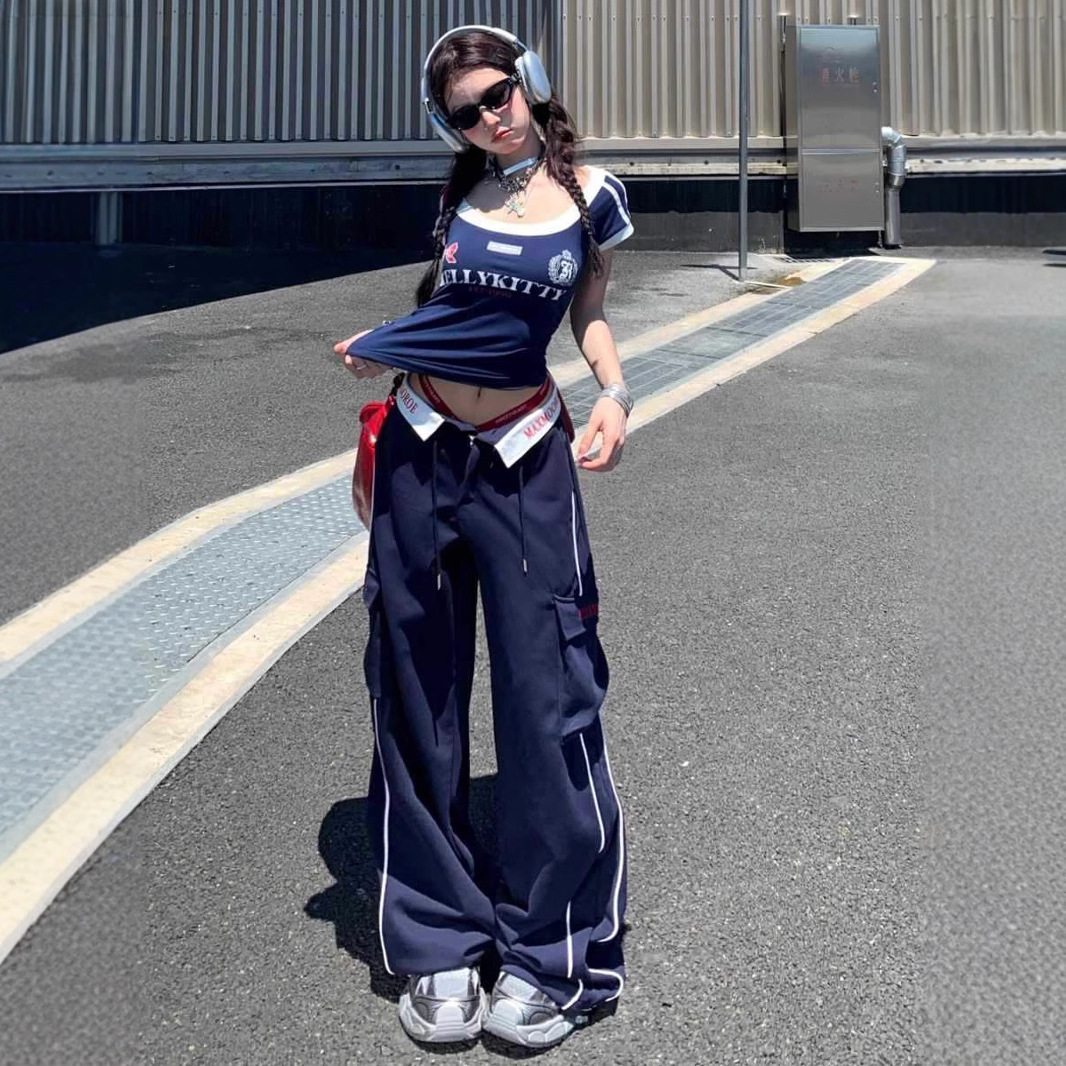 ストリートスポーツウェアスーツ女性の夏の学生韓国スタイルルーズファッションハイウエスト半袖オーバーオールカジュアルツーピースセット