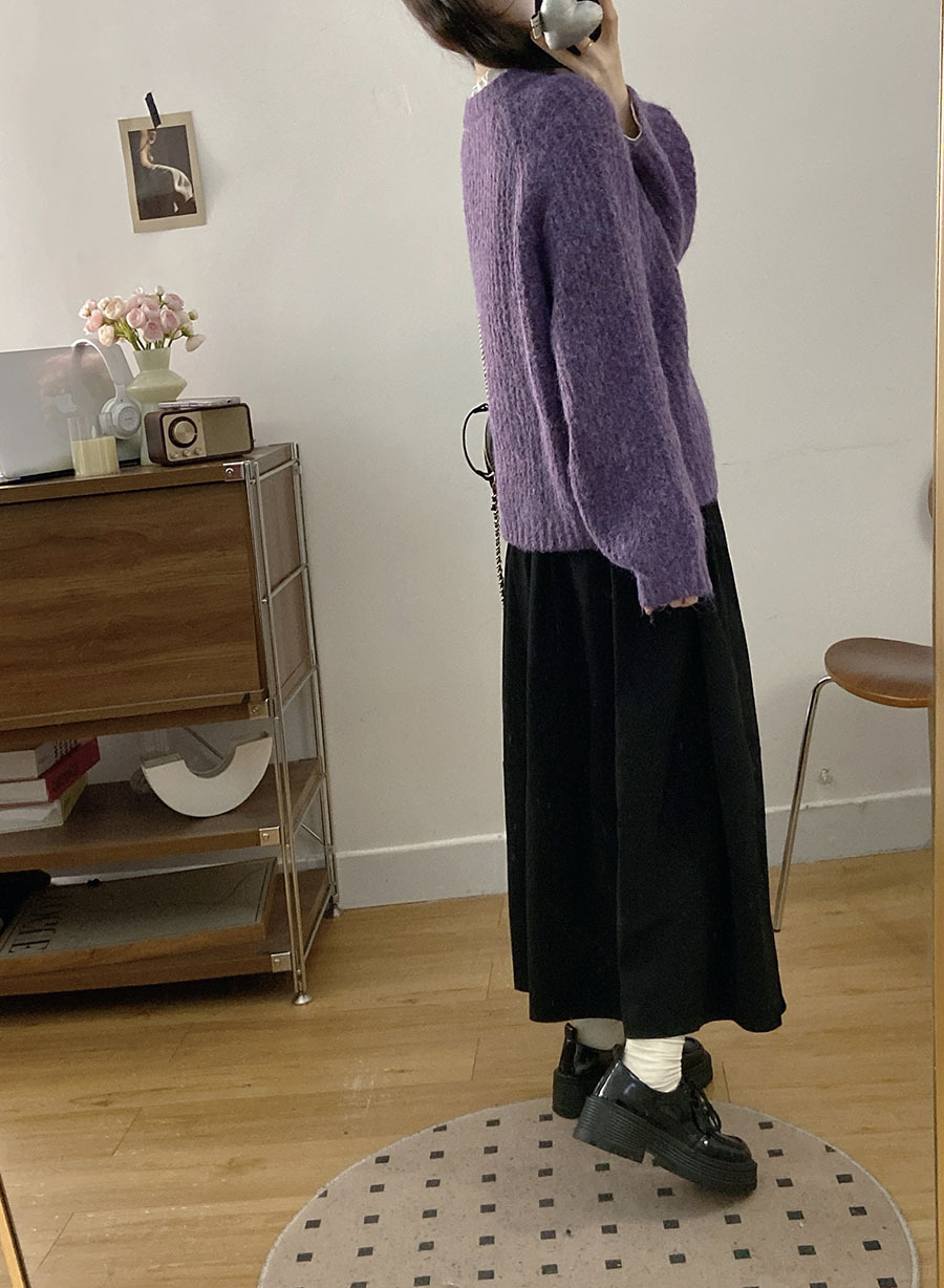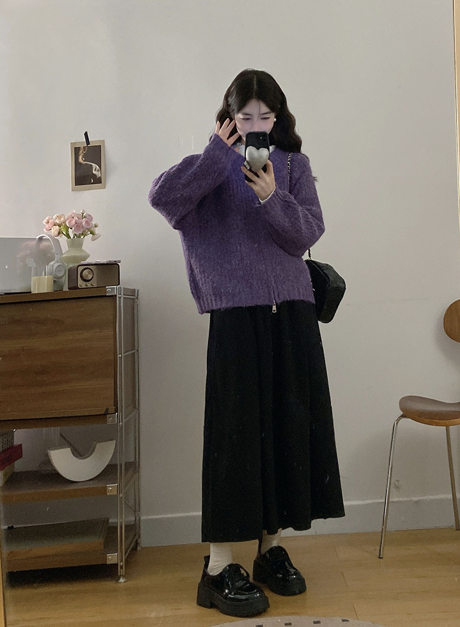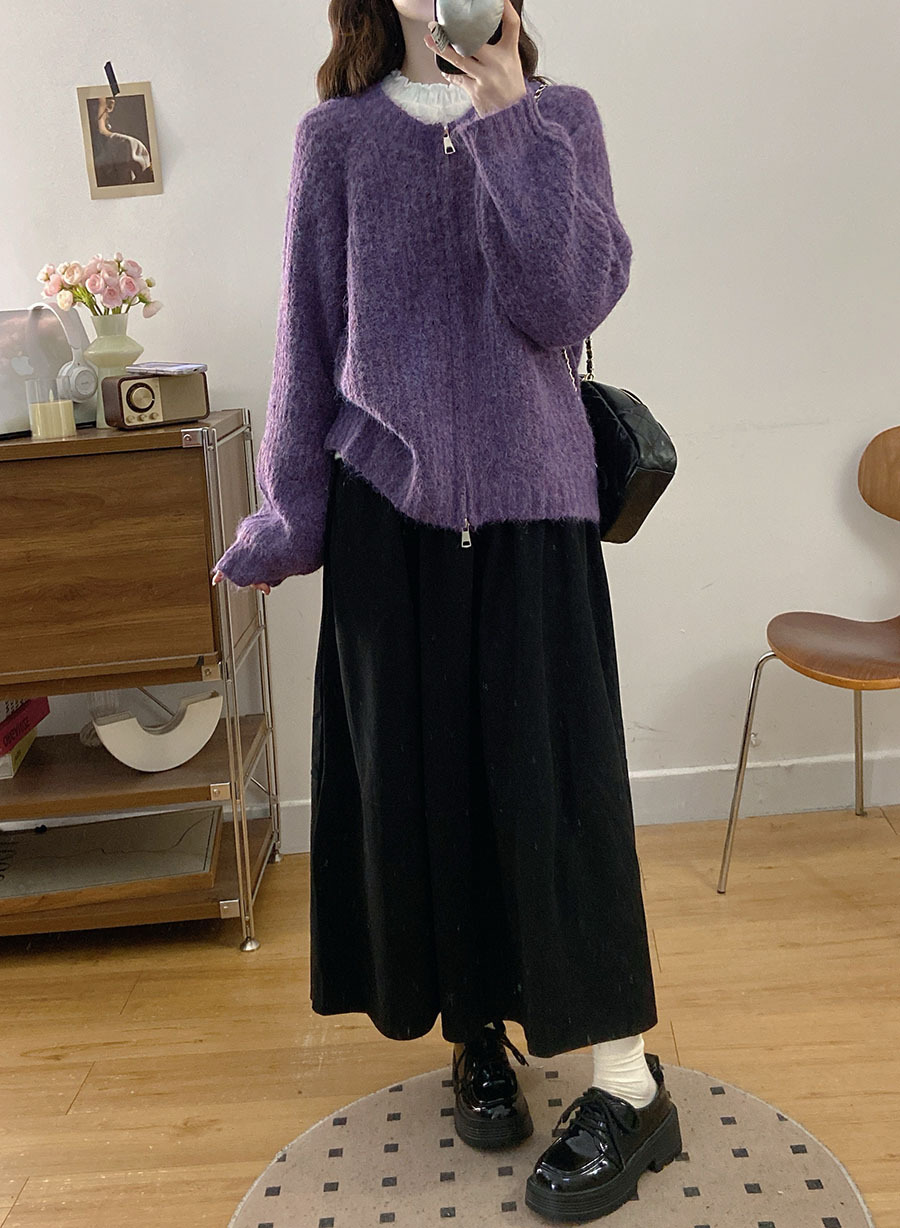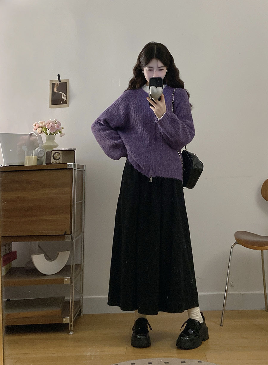 2025秋冬大码紫色针织百搭长袖圆领毛衣+蕾丝打底衫+半身裙三件套