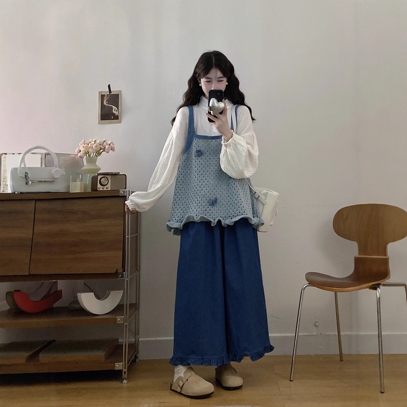 大码甜美立体花朵针织背心+白色衬衫+花边阔腿牛仔裤女秋三件套装