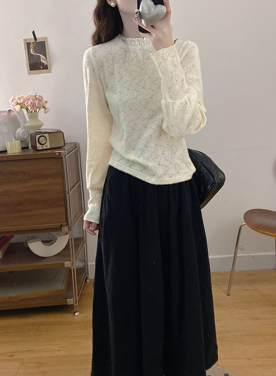 秋冬大码复古百搭设计感毛衣+半高领蕾丝打底衫+长款半身裙三件套