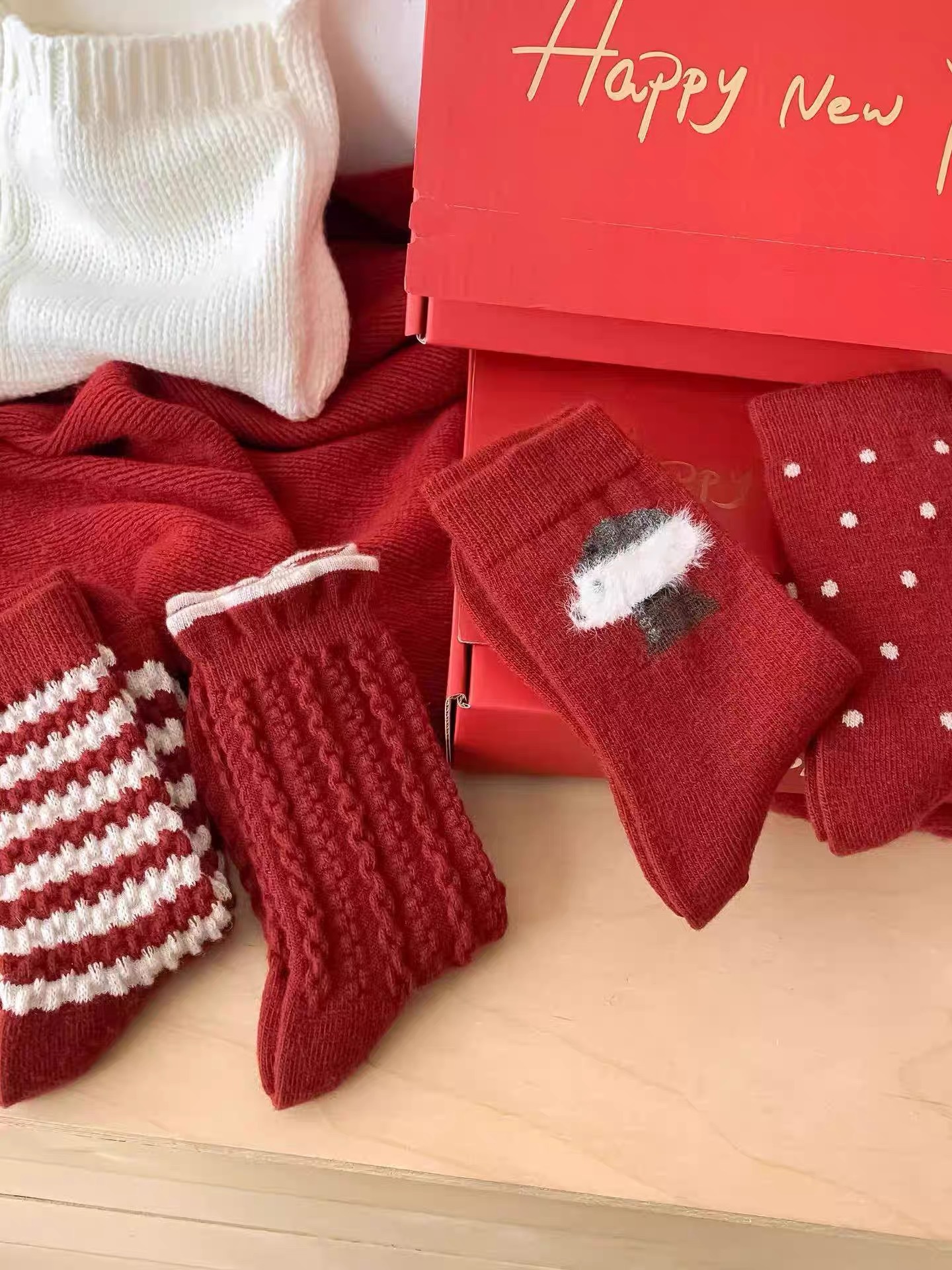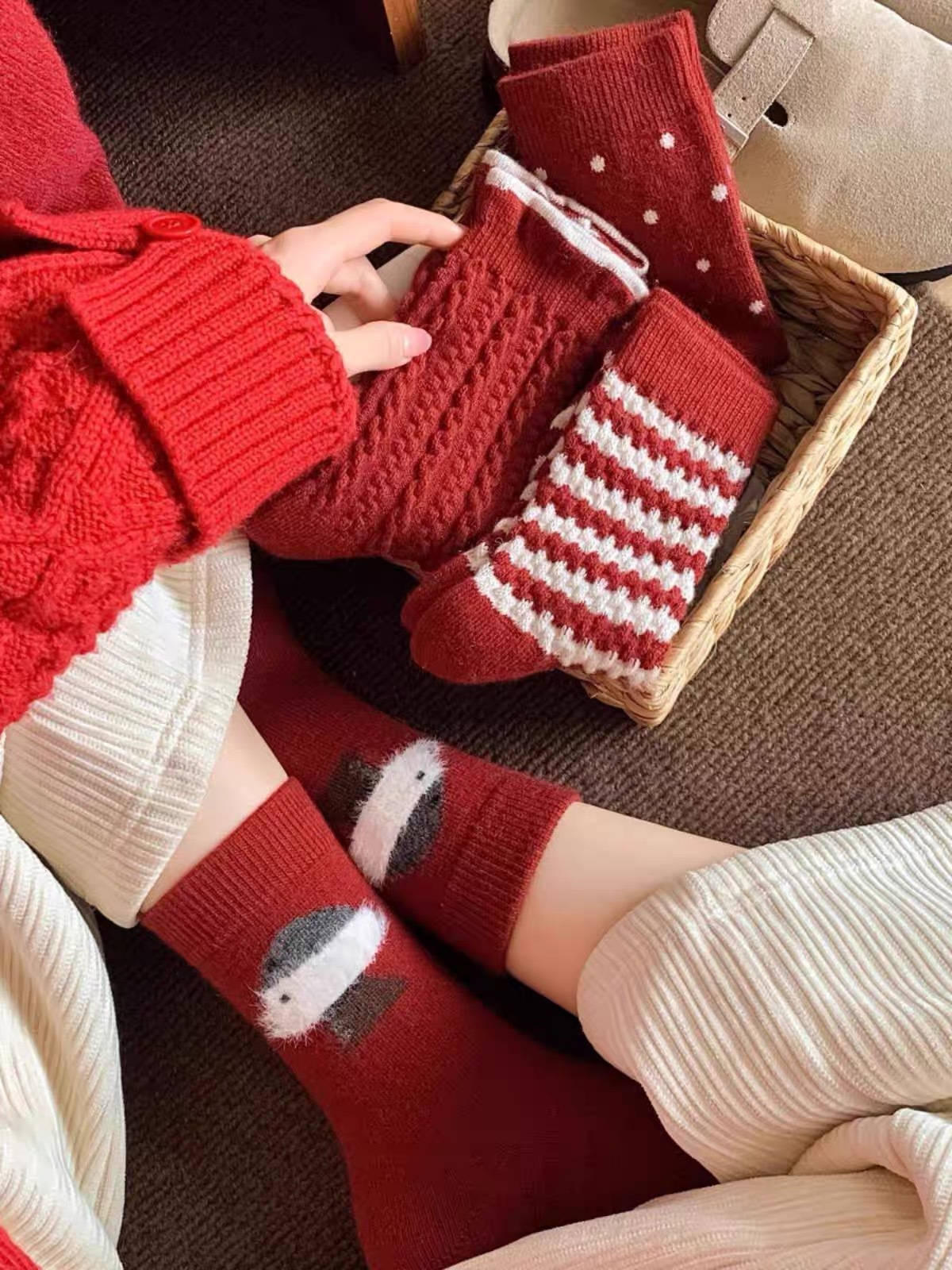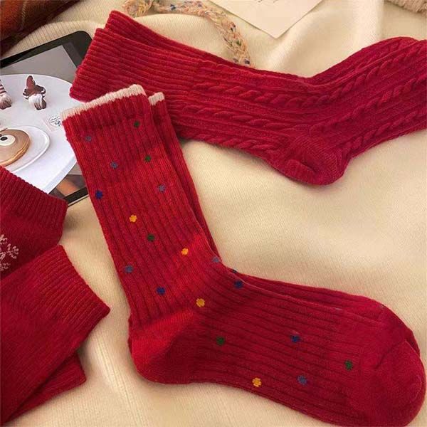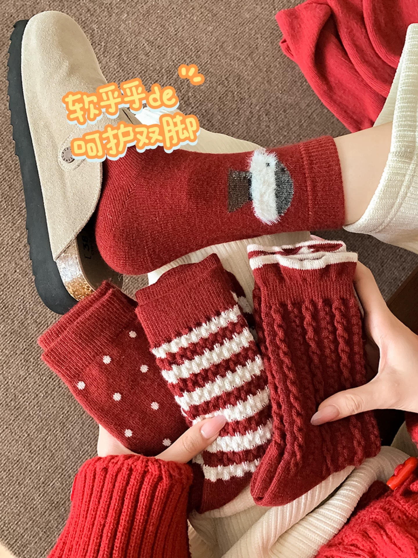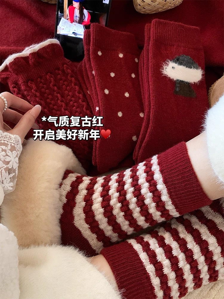 新款秋冬毛线加厚袜子红袜子百搭保暖新年圣诞线条波点中筒袜子女