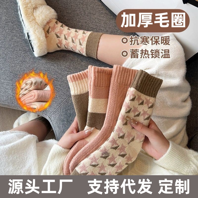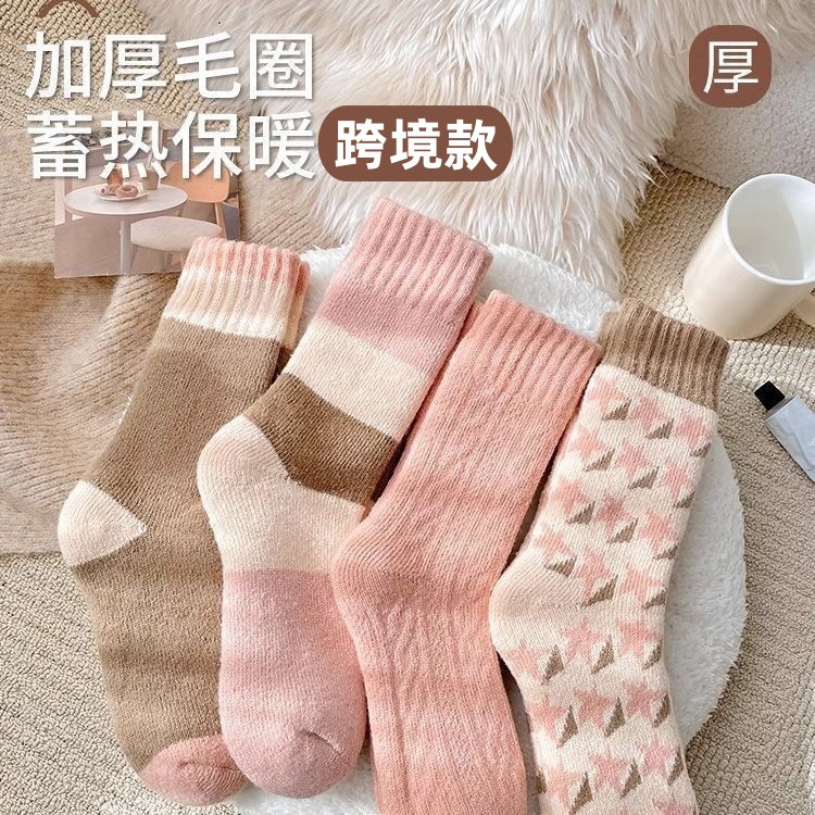 奕露跨境加厚保暖袜子女秋冬毛圈袜子中筒袜加绒毛巾地板长袜批发