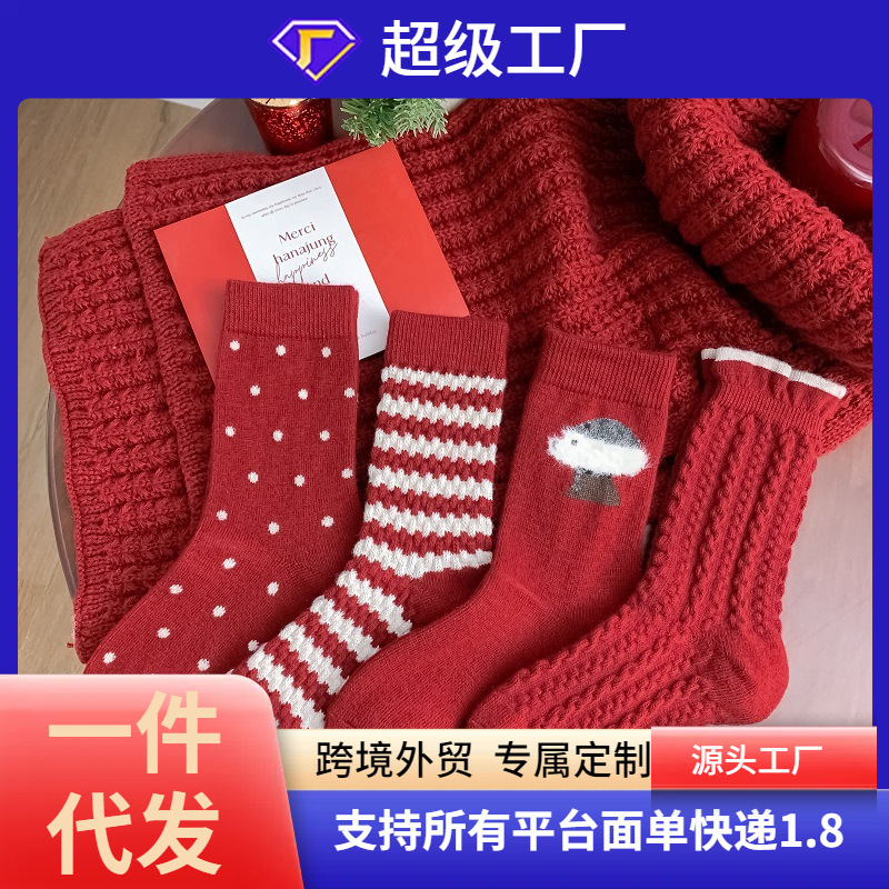 奕露本命年大红袜子女秋冬中筒袜简约甜美新年袜节日红色长袜批发