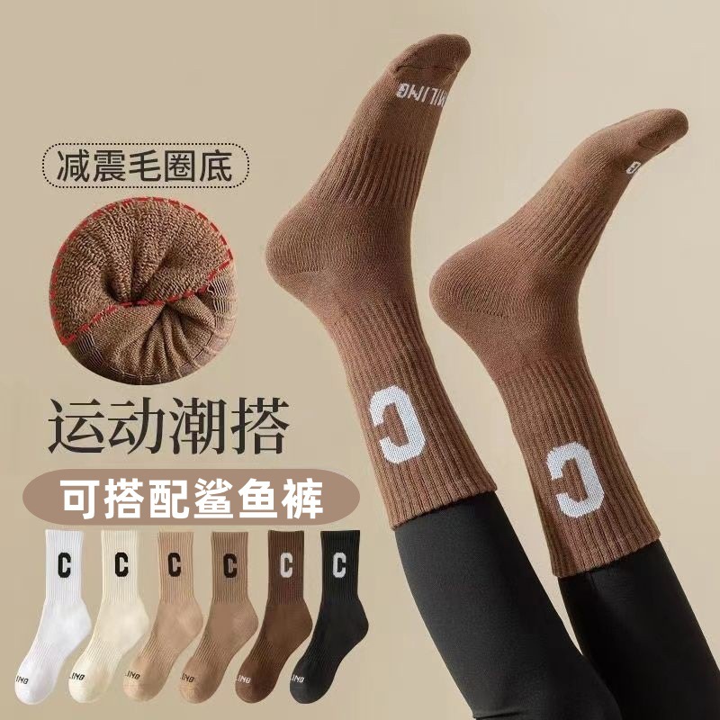 奕露跨境毛圈袜子女秋冬加绒加厚C字母中筒袜毛巾底配鲨鱼裤长袜