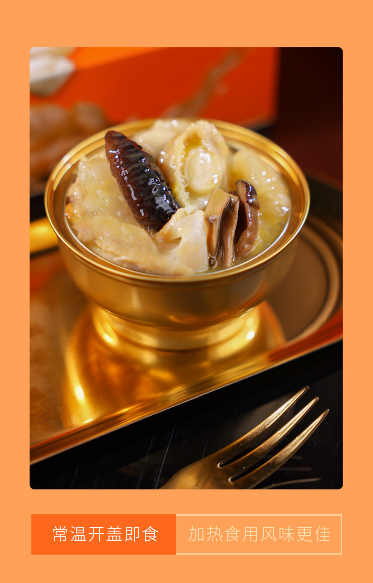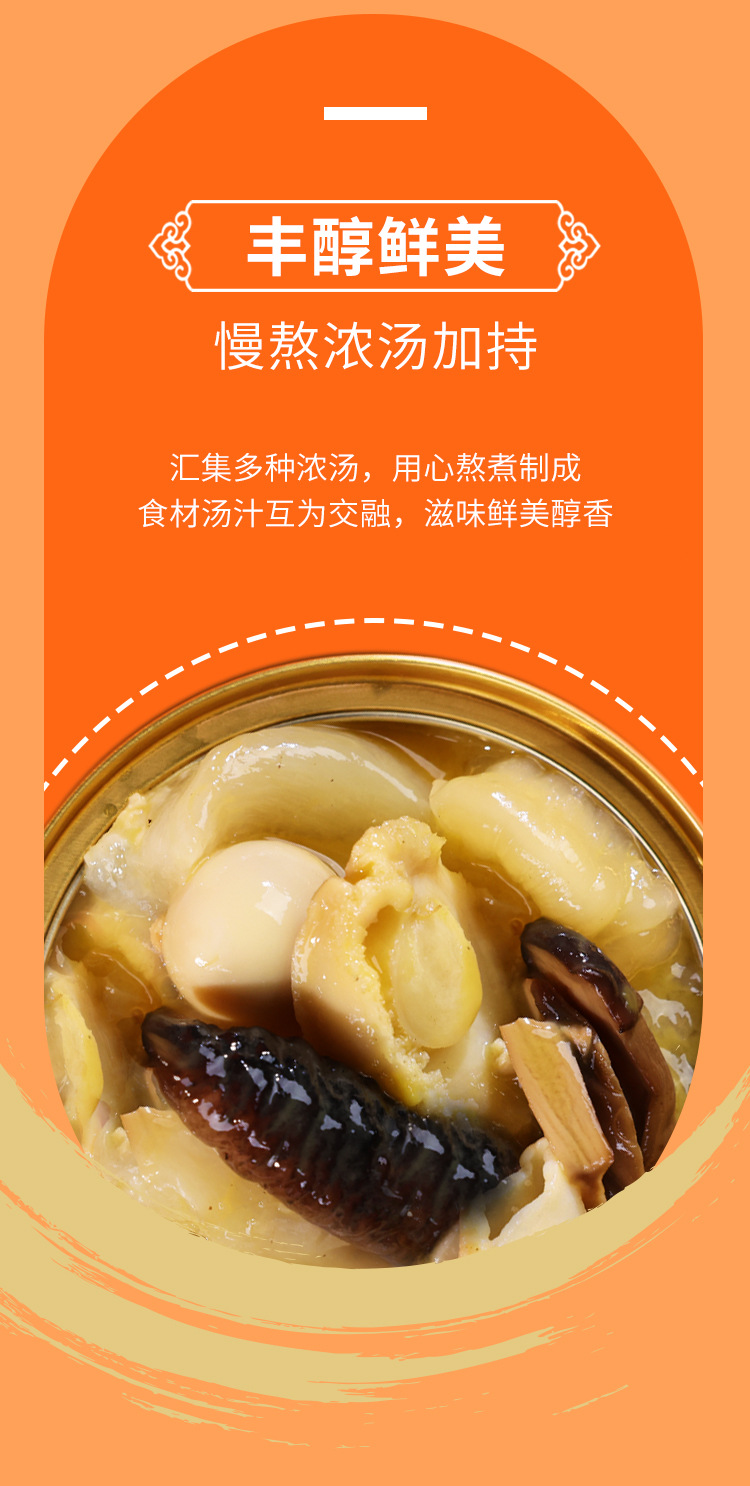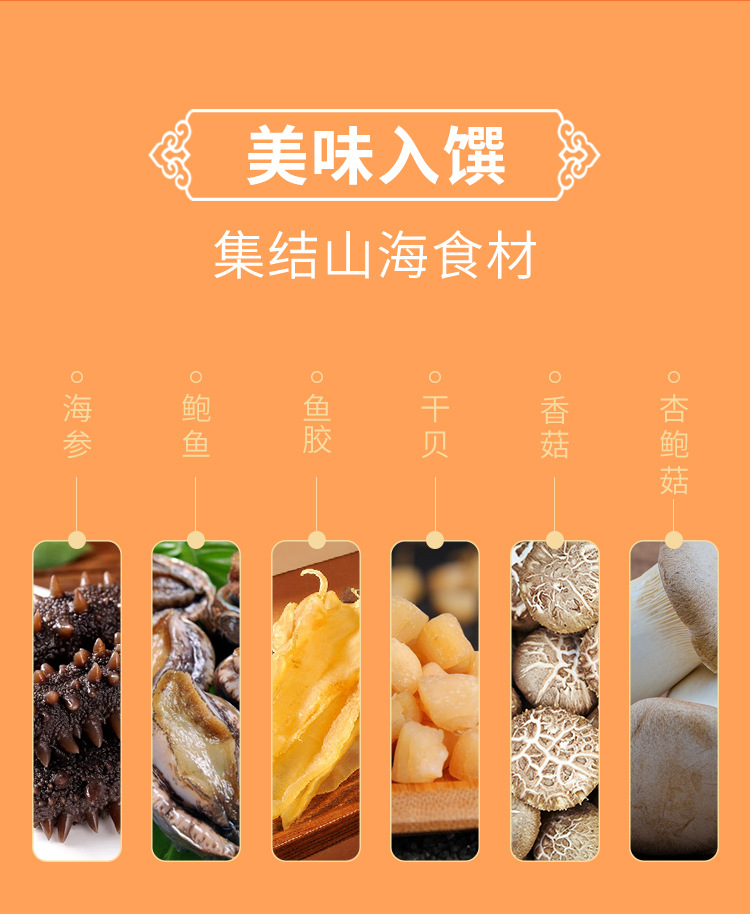 主要原料 海参,花胶,鲍鱼,杏鲍菇、干贝、金汤