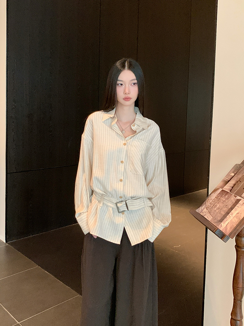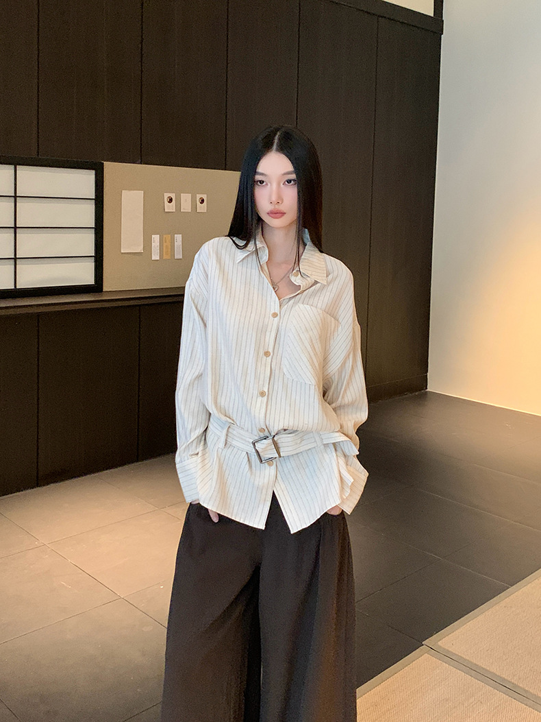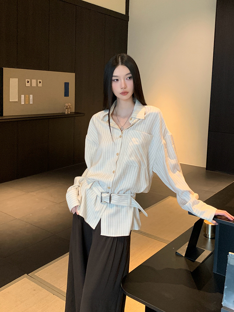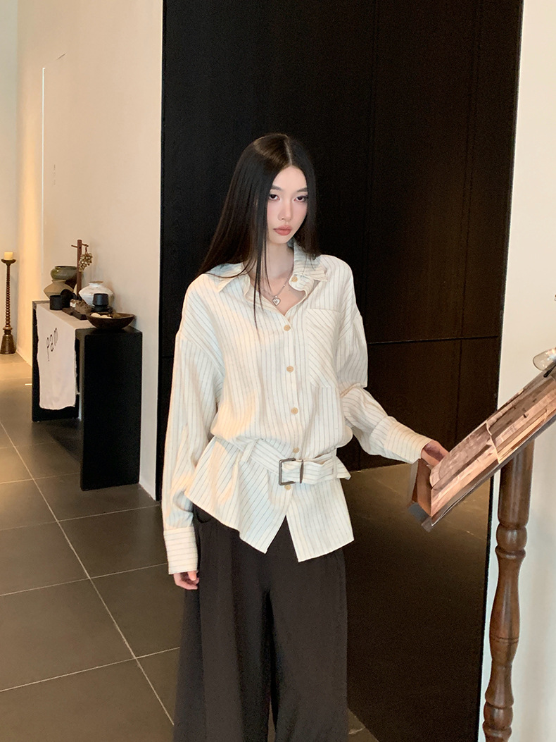新款女装收腰条纹衬衫秋设计感小众长袖复古上衣