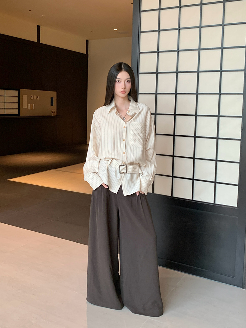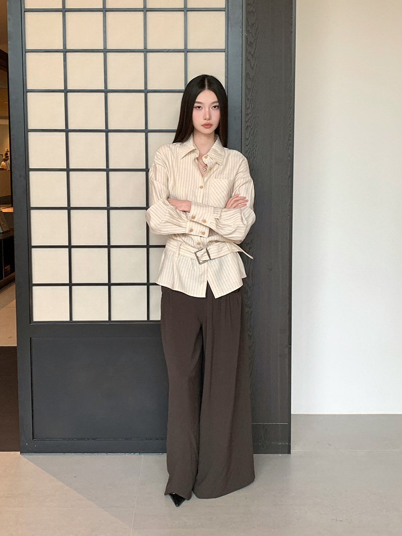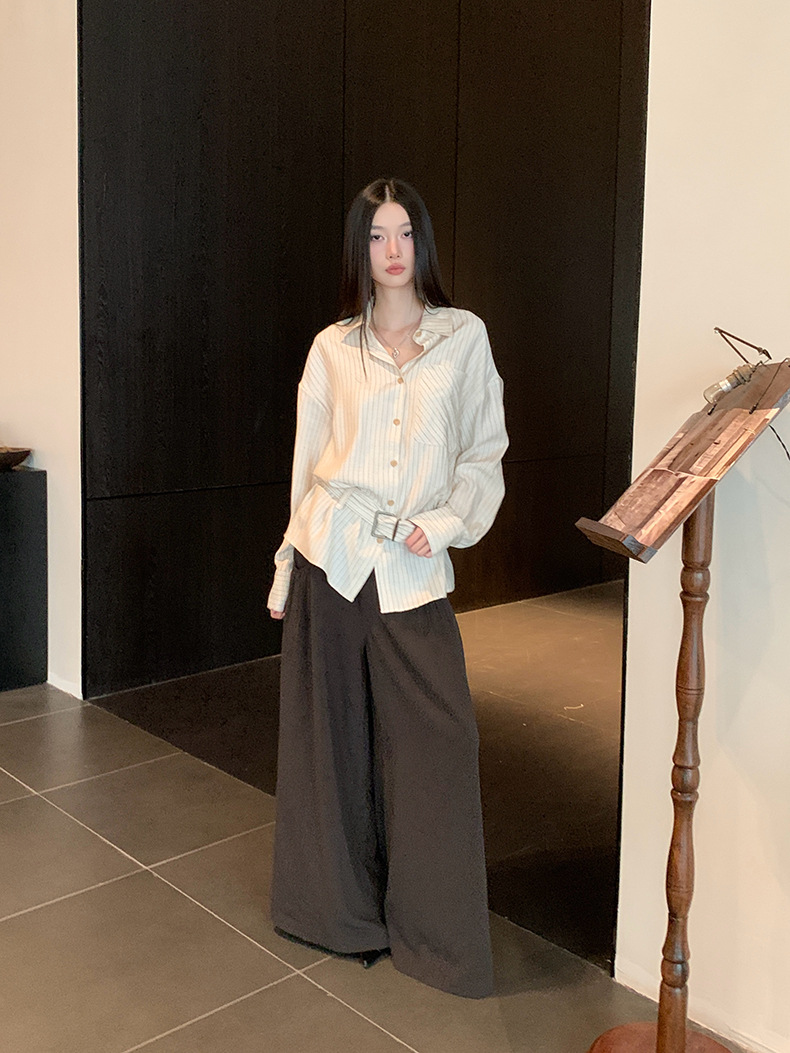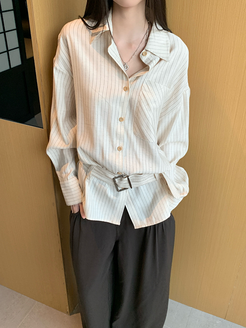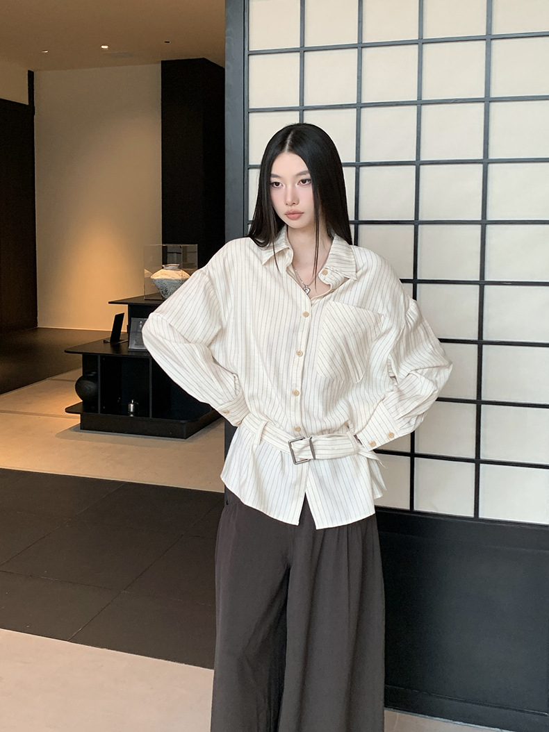 新款女装收腰条纹衬衫秋设计感小众长袖复古上衣