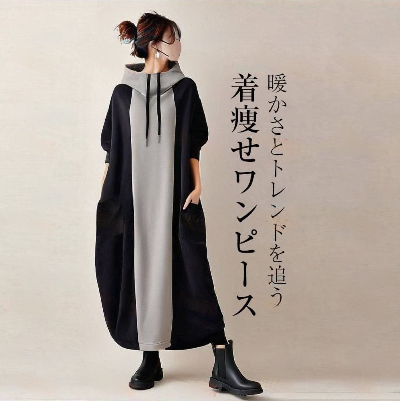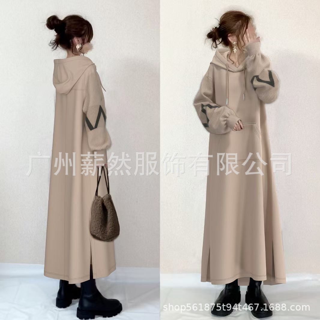 2025年春の新作、売れ筋商品!おしゃれなニット袖とパッチワークのフード付きゆったりワンピース