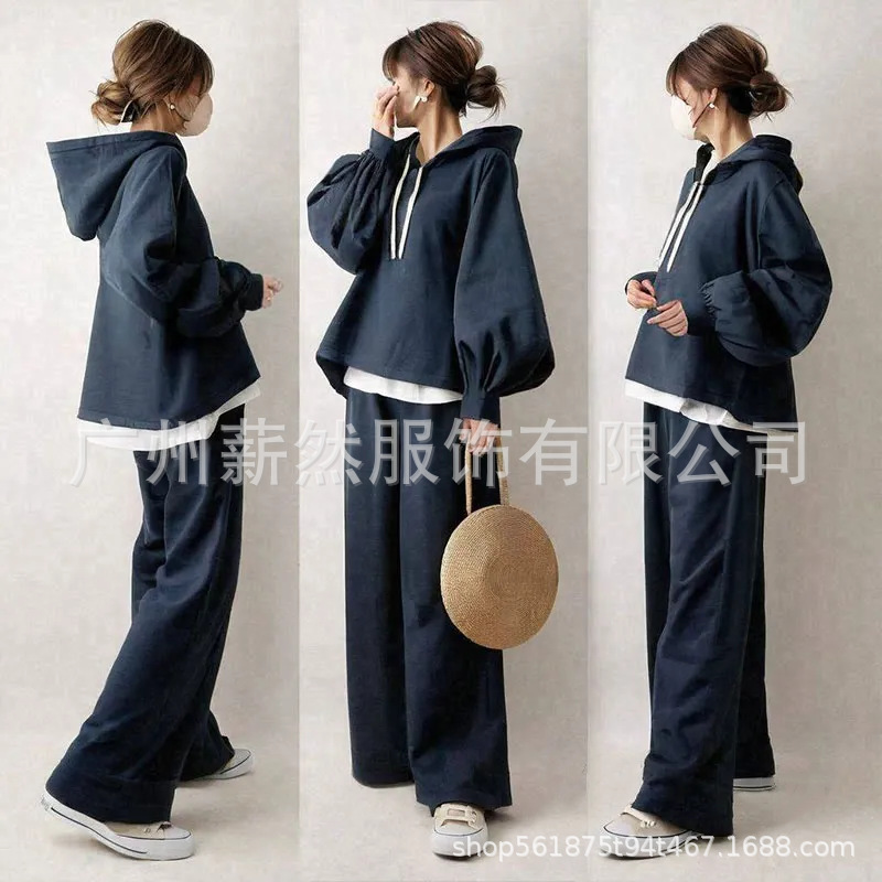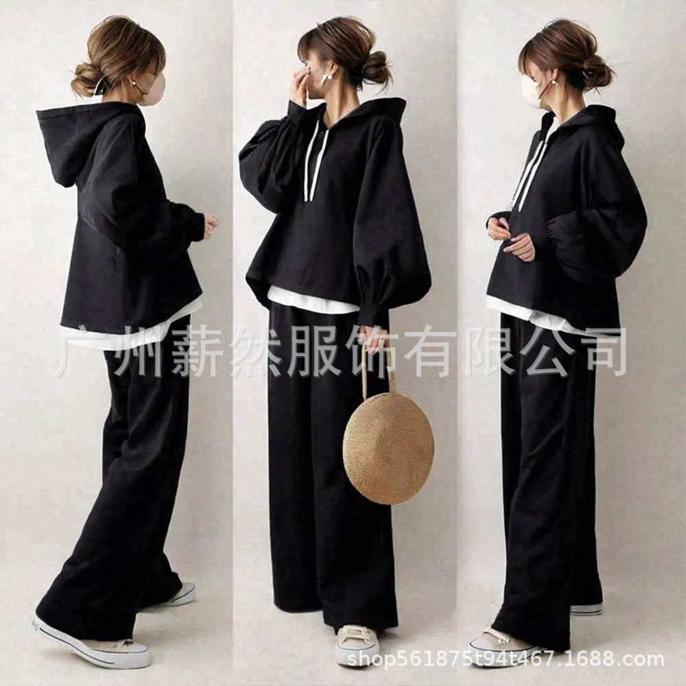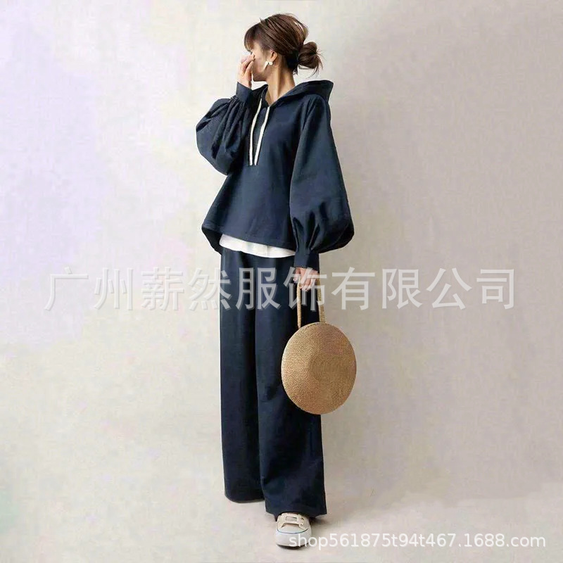 三色现货2026春秋热卖新款套装连帽灯笼袖卫衣+阔腿裤休闲两件套