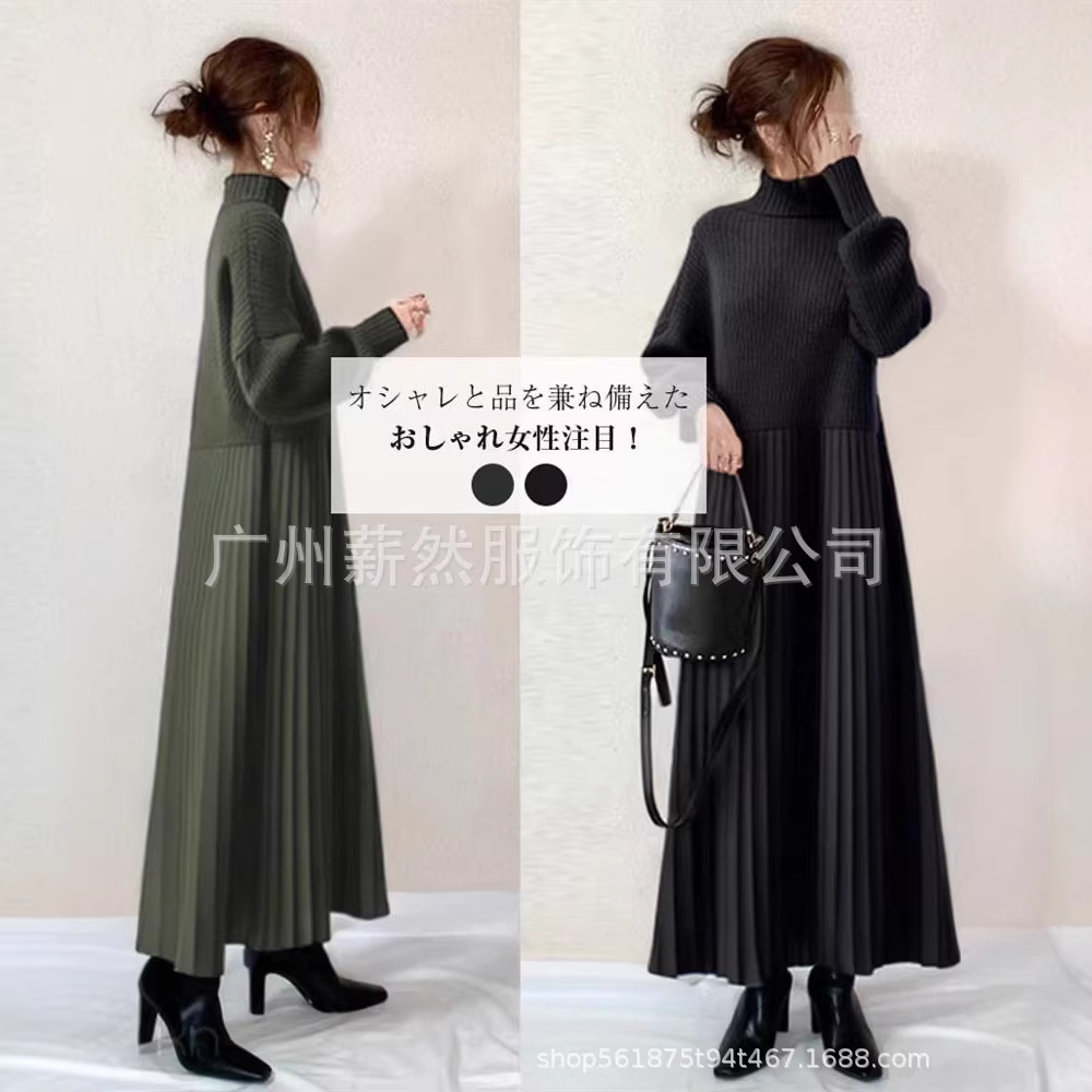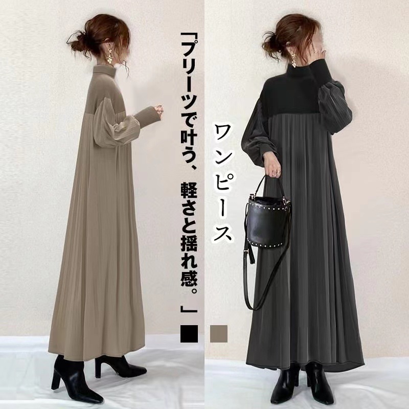 2色展開、日本製、秋冬新作、ハイネック長袖ニット、オルガンプリーツのロングワンピース