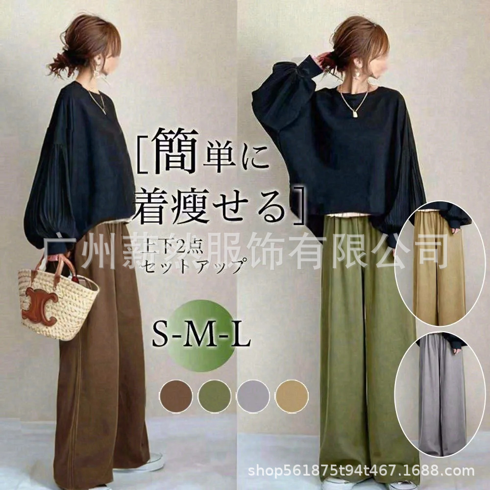 在庫あり 跨境人気商品セット 2025年初春新作 日本風ラウンドネックパッチワークトップス+ワイドパンツセット