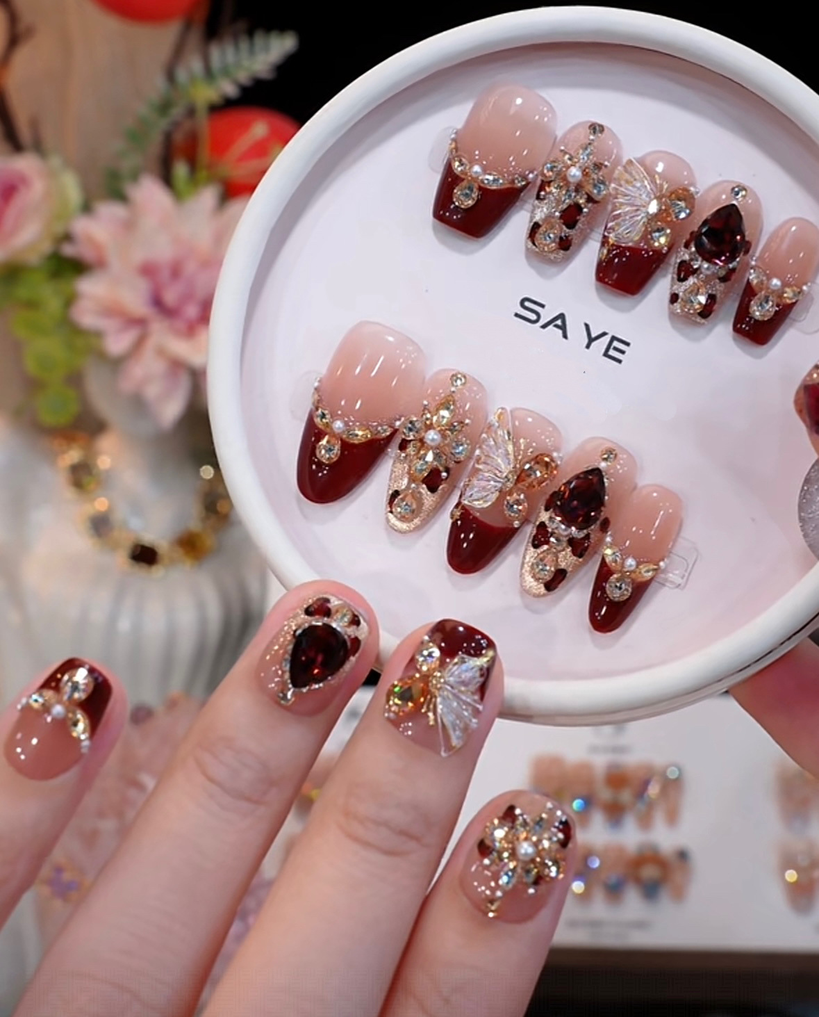 【甜梦千金】秋冬新款纯手工穿戴甲酒红蝴蝶高级显白纯手作美甲片