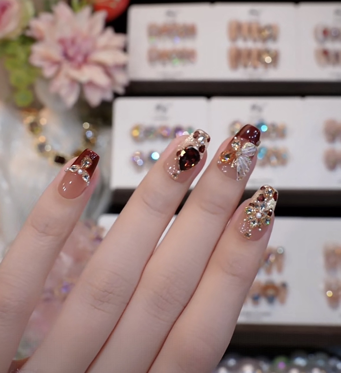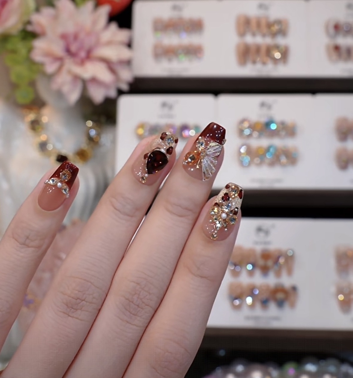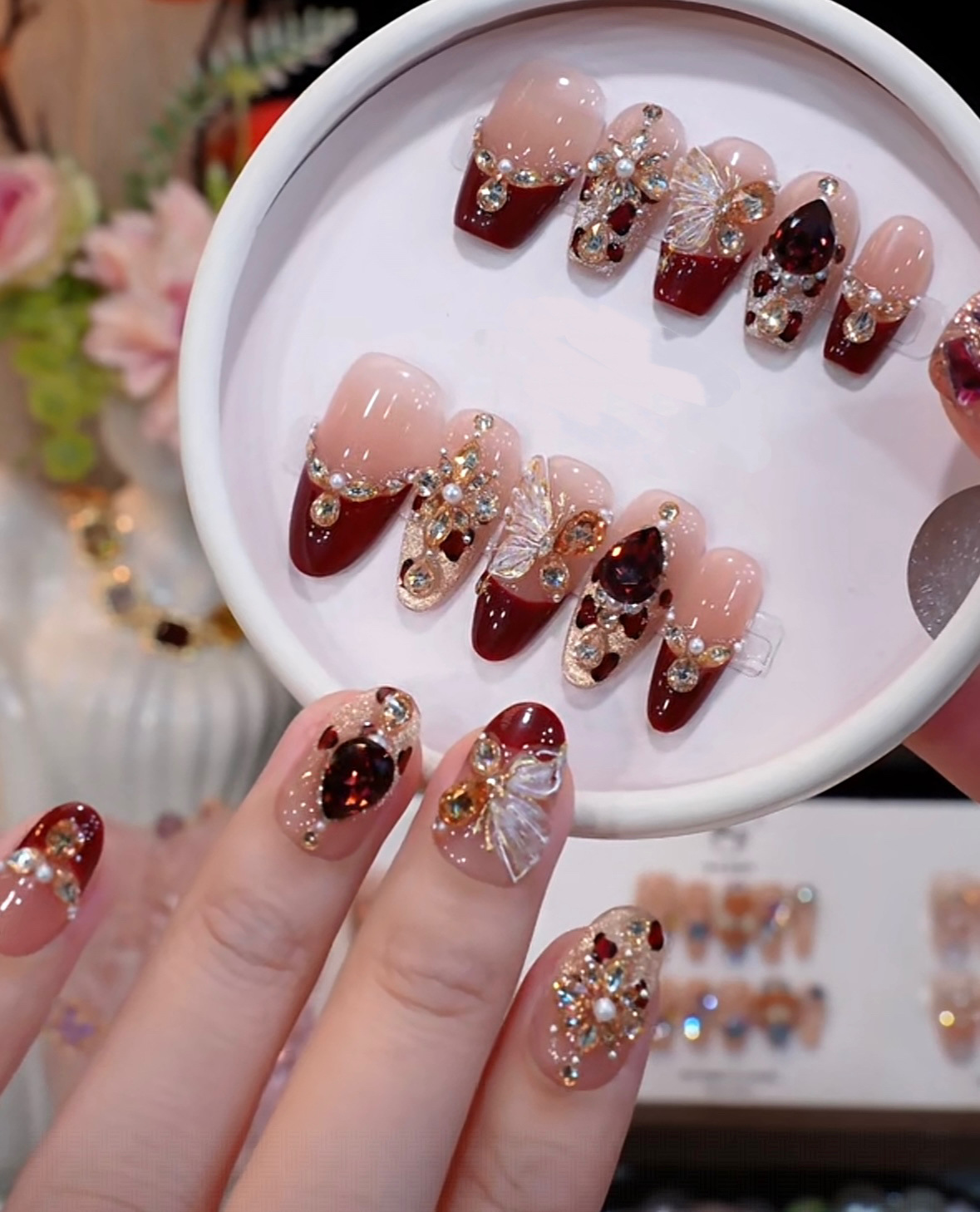 【红酒杯】新款纯手工穿戴甲红色法式锆石光疗高级显白纯手作美甲