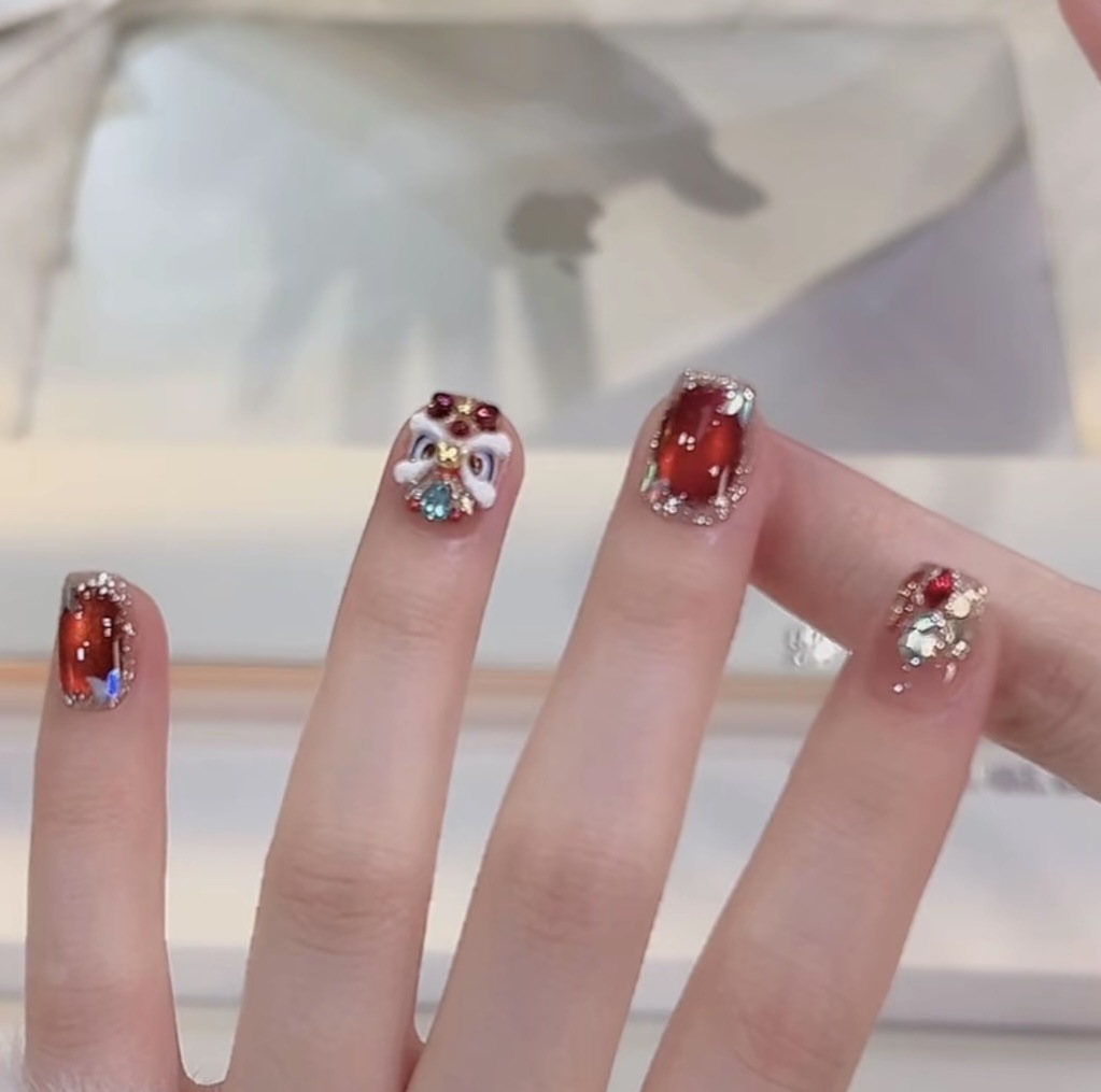 【万事大吉】纯手工穿戴甲红色狮子拼钻高级感显白纯手作美甲贴片