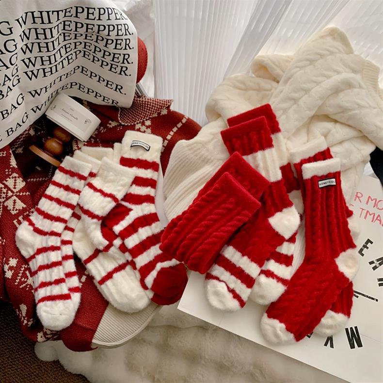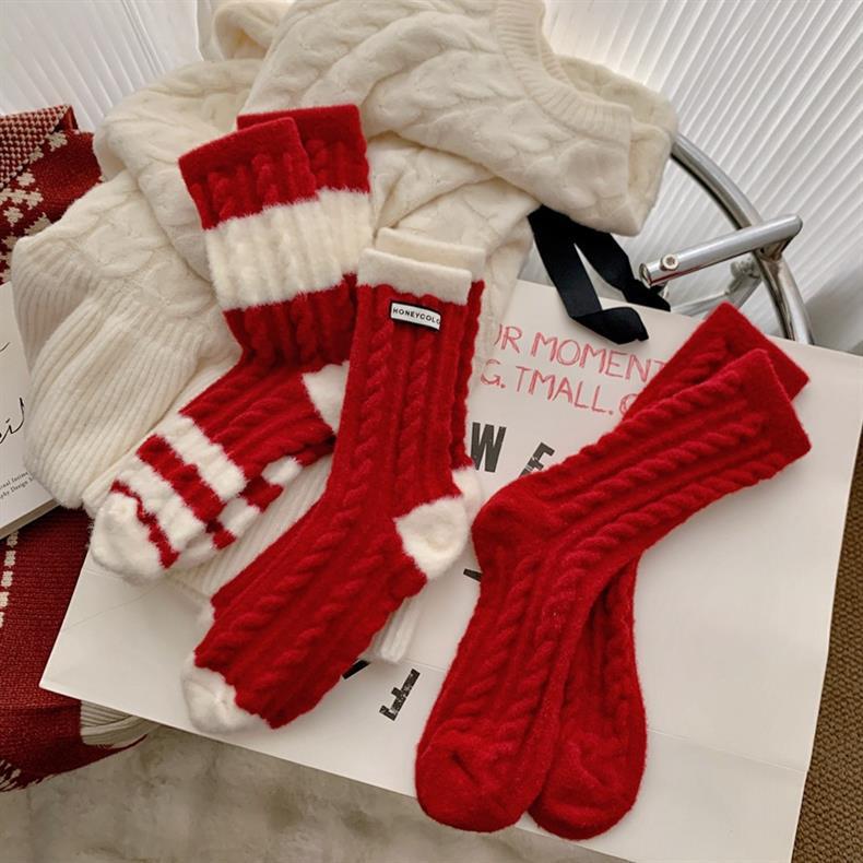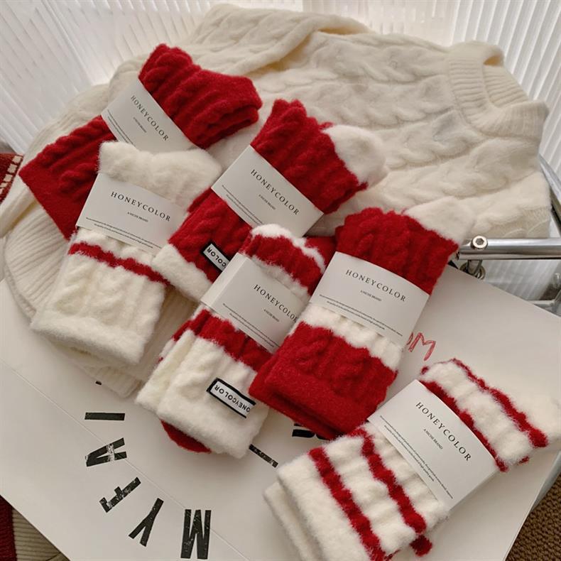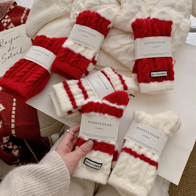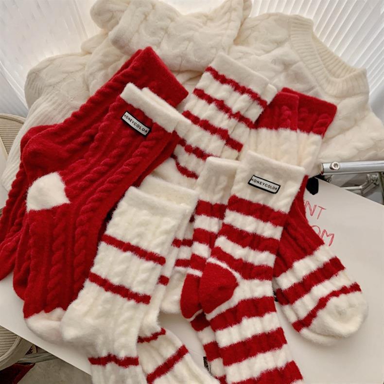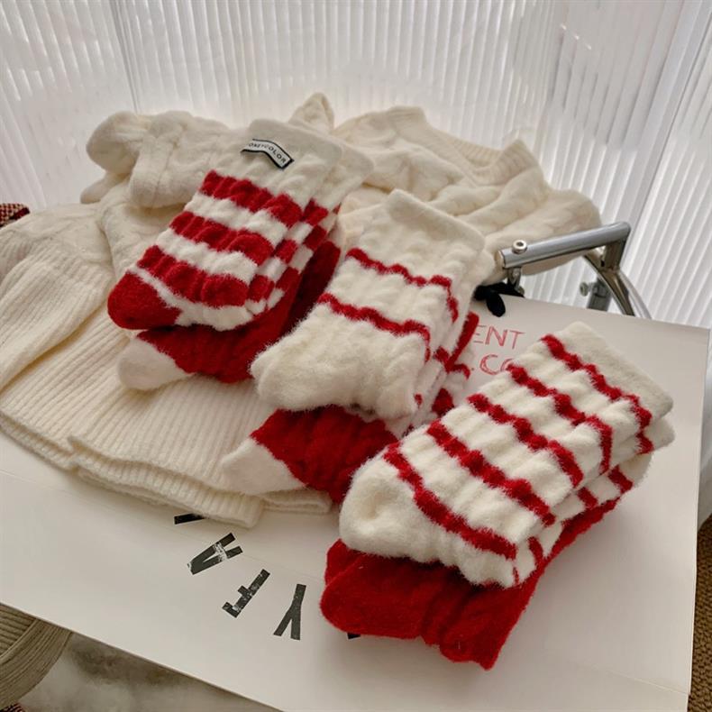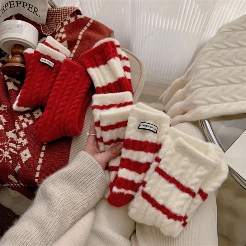 冬季新年澳绒袜子红色条纹女士中筒袜羊绒新年袜子 保暖加绒红袜
