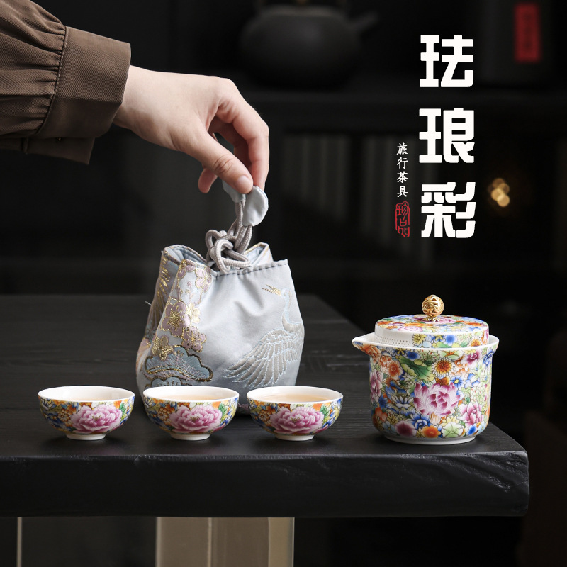 エナメルポータブルトラベルティーセットハイエンド中国宮殿スタイルの1ポットと3カップ屋外ティーポットクイックカップ