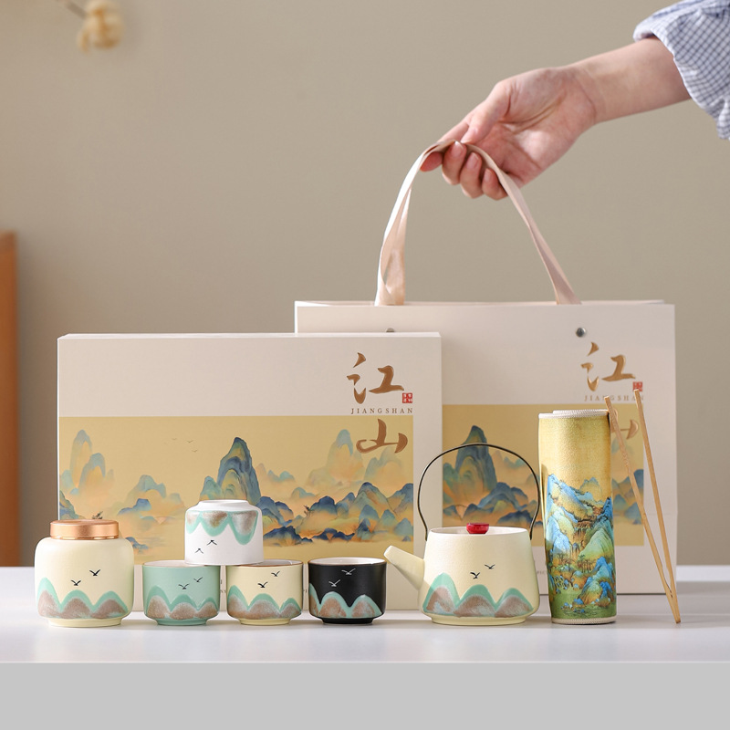 Guochao 文化的で創造的な千里江山ティーセット高価値レリーフグラデーションカラーティーポットティーカップセットビジネスギフト