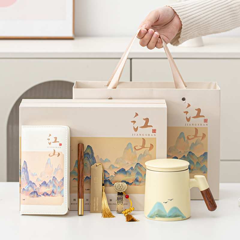 見栄えの良い手描きの千里江山セラミックオフィスカップ茶水分離ティーカップフィルター水カップ実用的なビジネスギフト