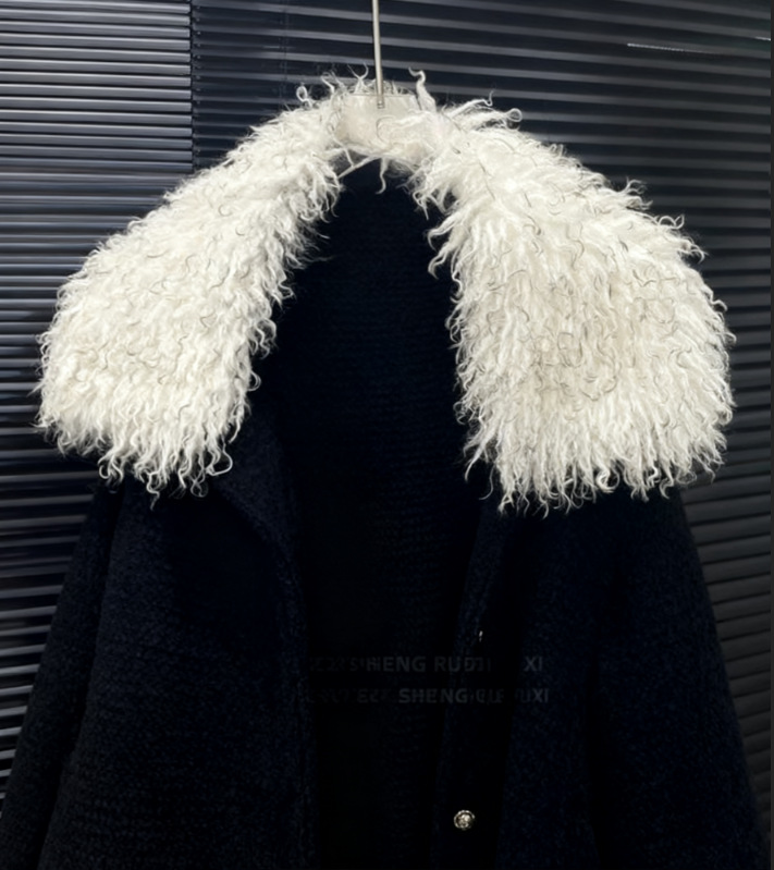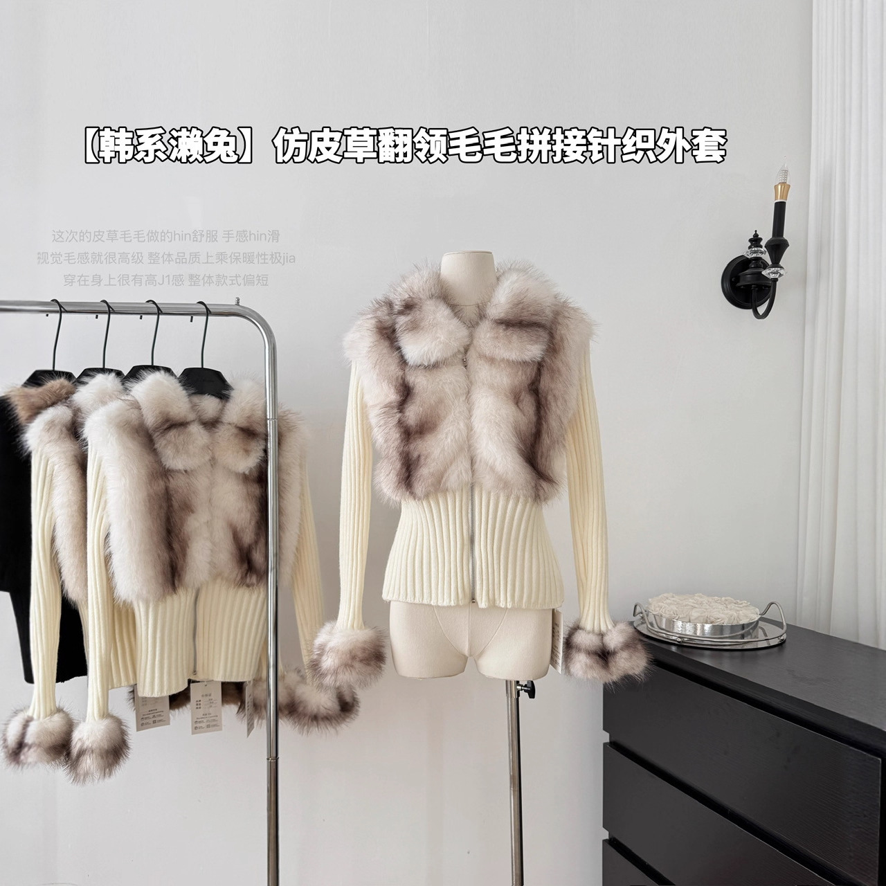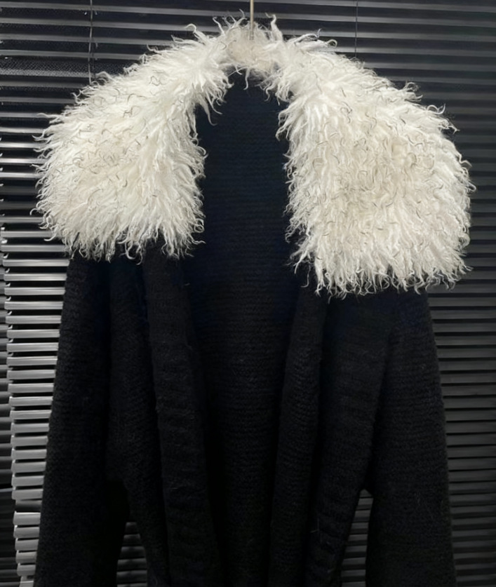 韩系濑兔非市面*巨滑仿皮草翻领毛毛拼接针织开衫外套