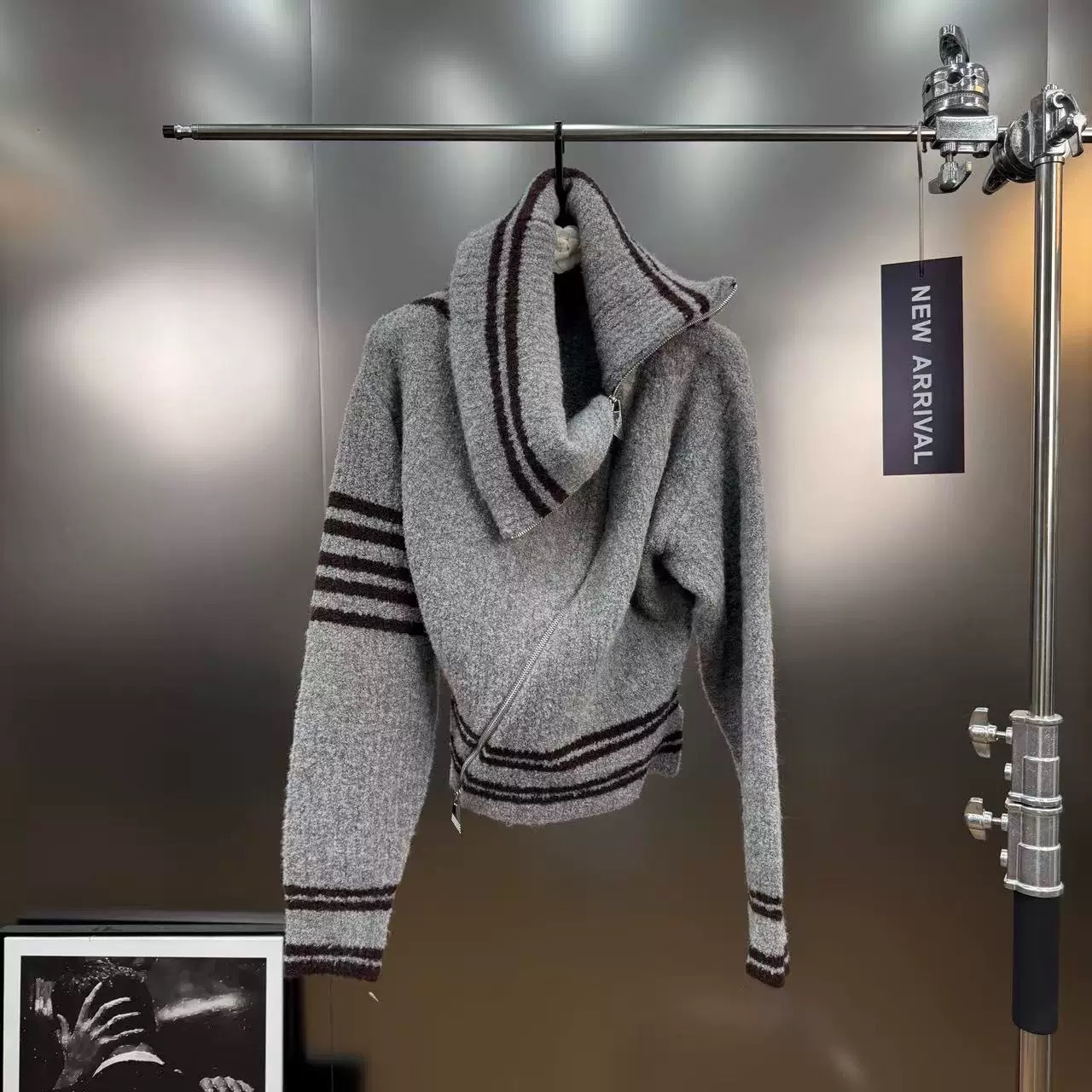 2025早秋新款小众灰色高领斜拉链长袖针织开衫收腰条纹休闲毛衣女