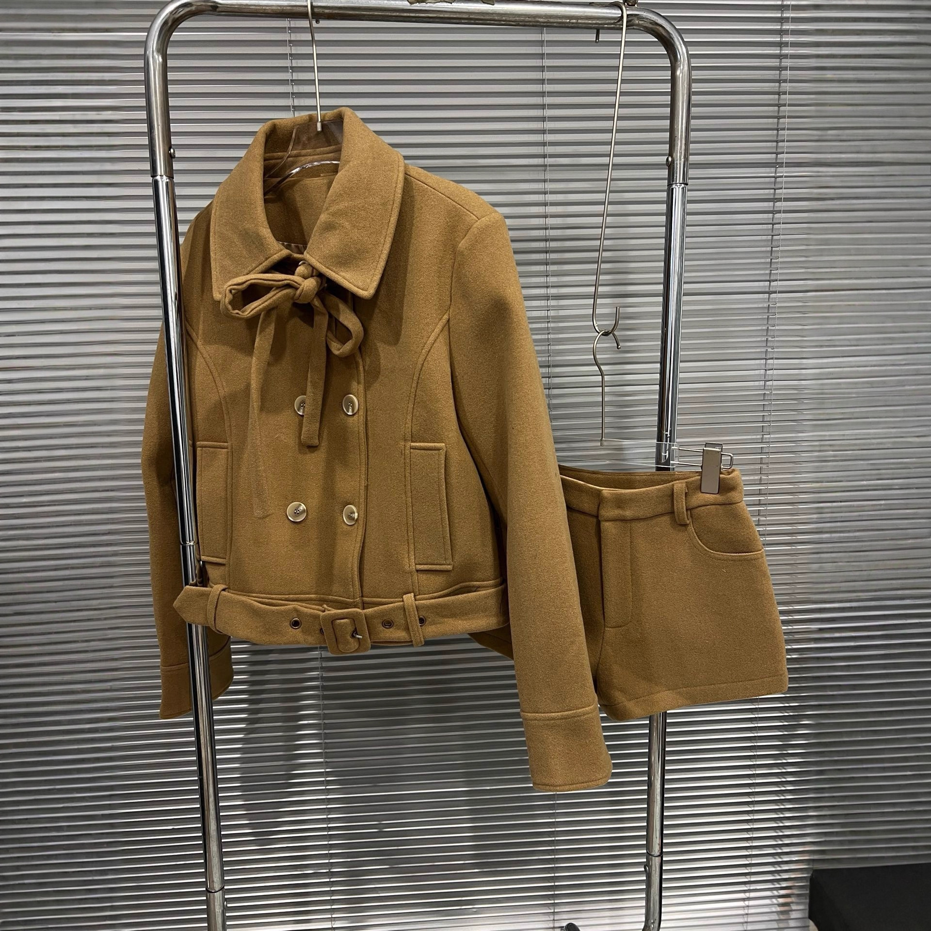 2025年秋冬新款经典摩登复古双排扣翻领毛呢夹克外套+短裤套装女