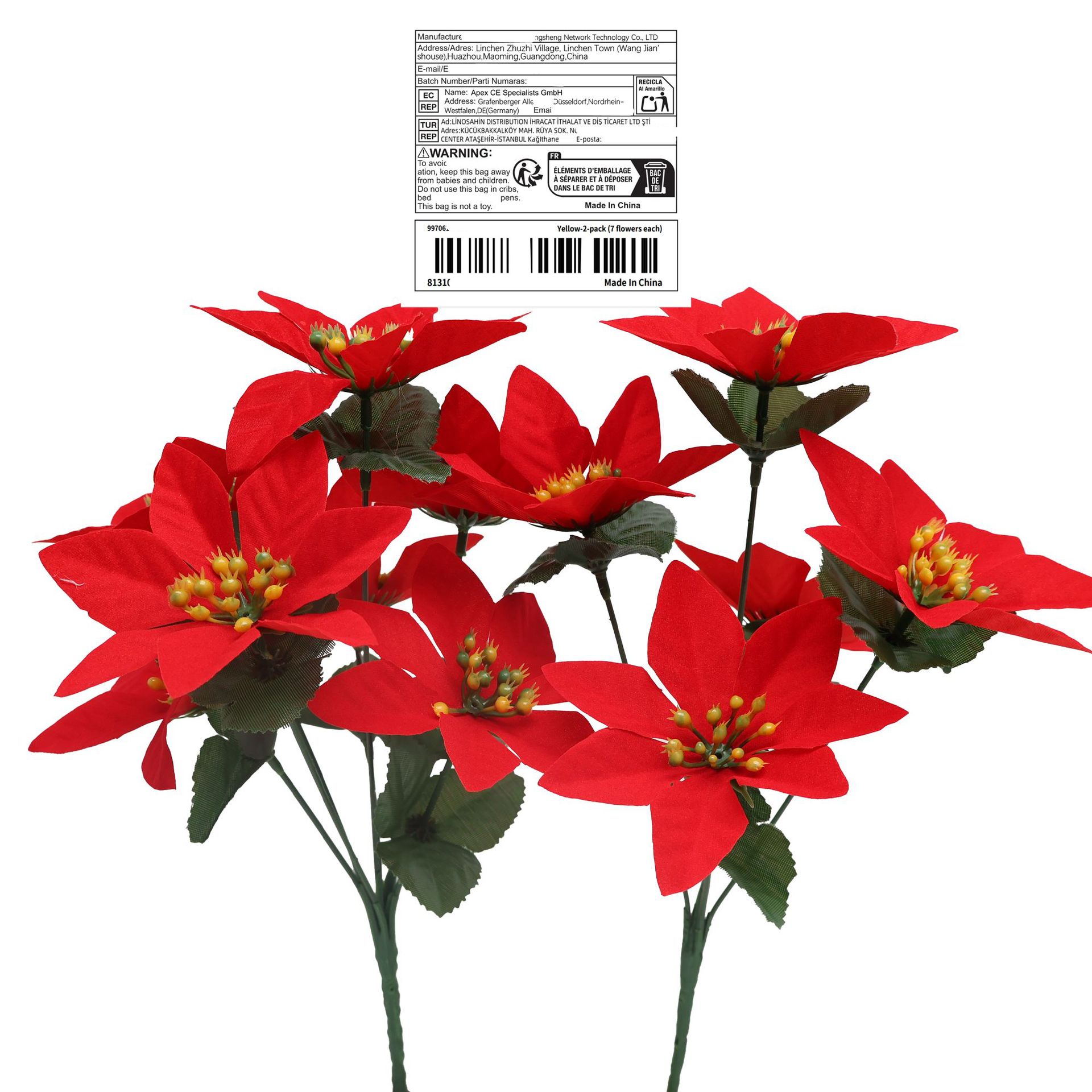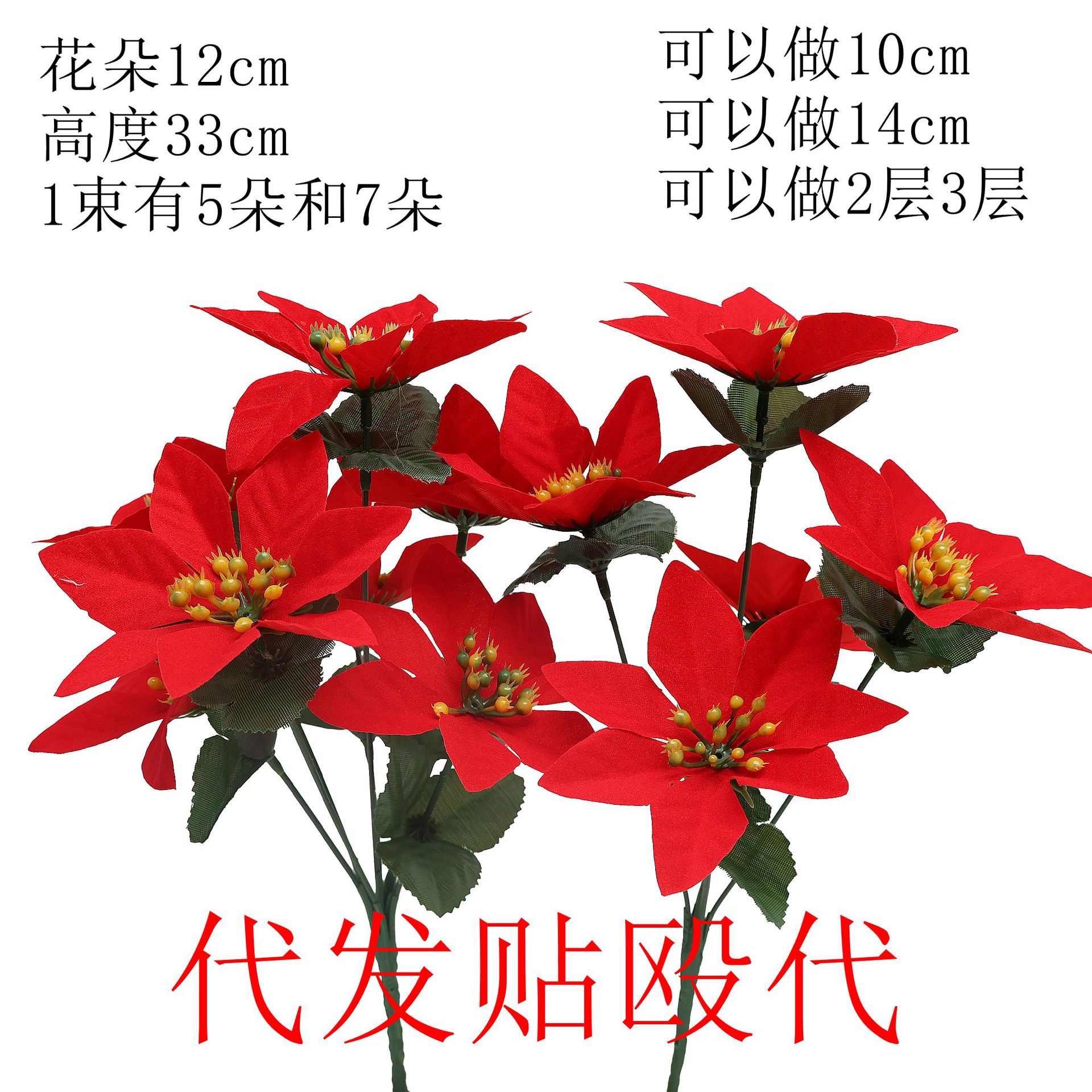 跨境代发贴欧代标仿真花仿真圣诞花丝印叶7头一品红花束厂家批发