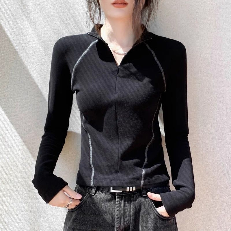 拉链半高领双面德绒长袖T恤女秋冬新款修身显瘦内搭保暖打底上衣