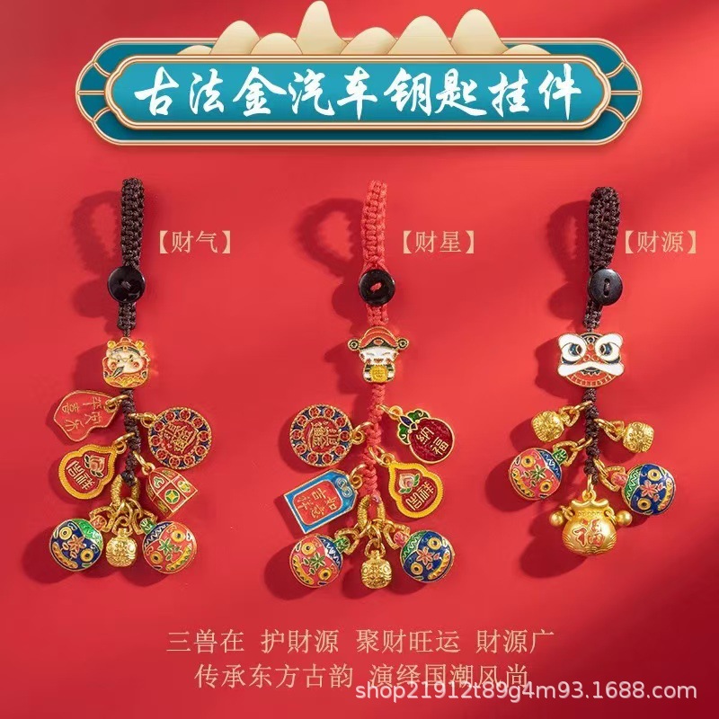 汽车钥匙扣财神爷吞金兽一家三口古法金招财钥匙链手机链饰品挂件