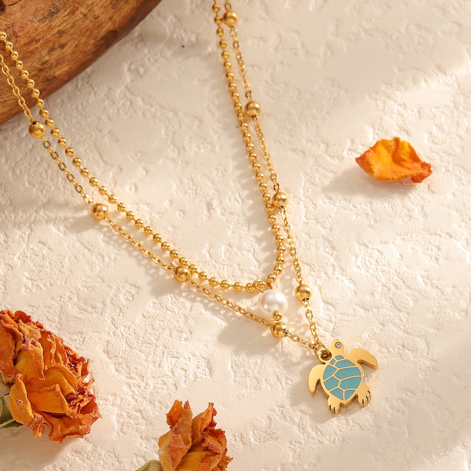 鱼珍珠双层项链 :波珠链长39cm,宽2mm,04十字夹3.5mm珠链长44+5cm,海龟14.6x15.4mm,珍珠6mm
