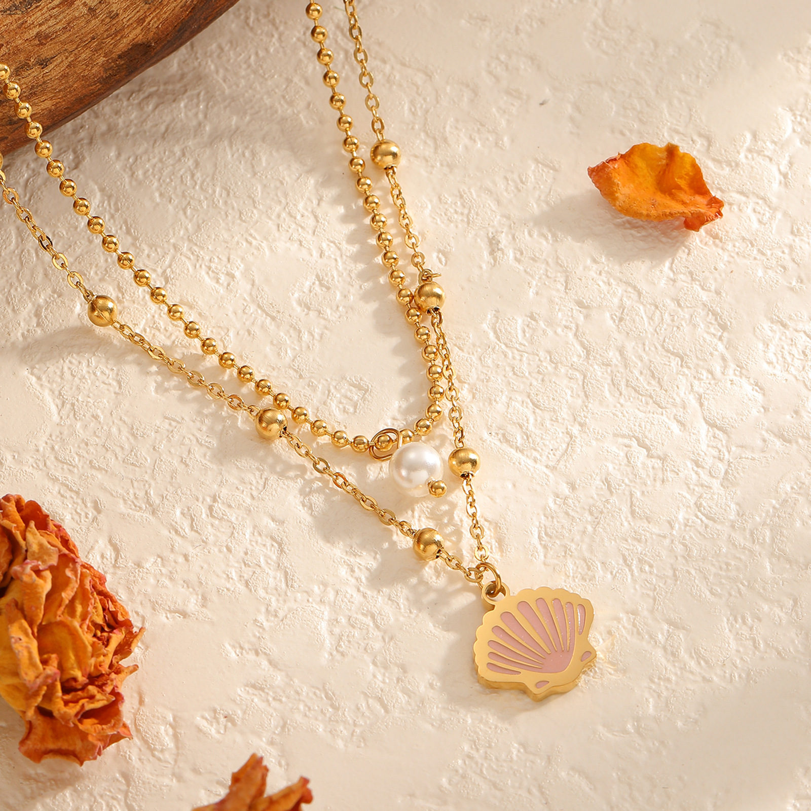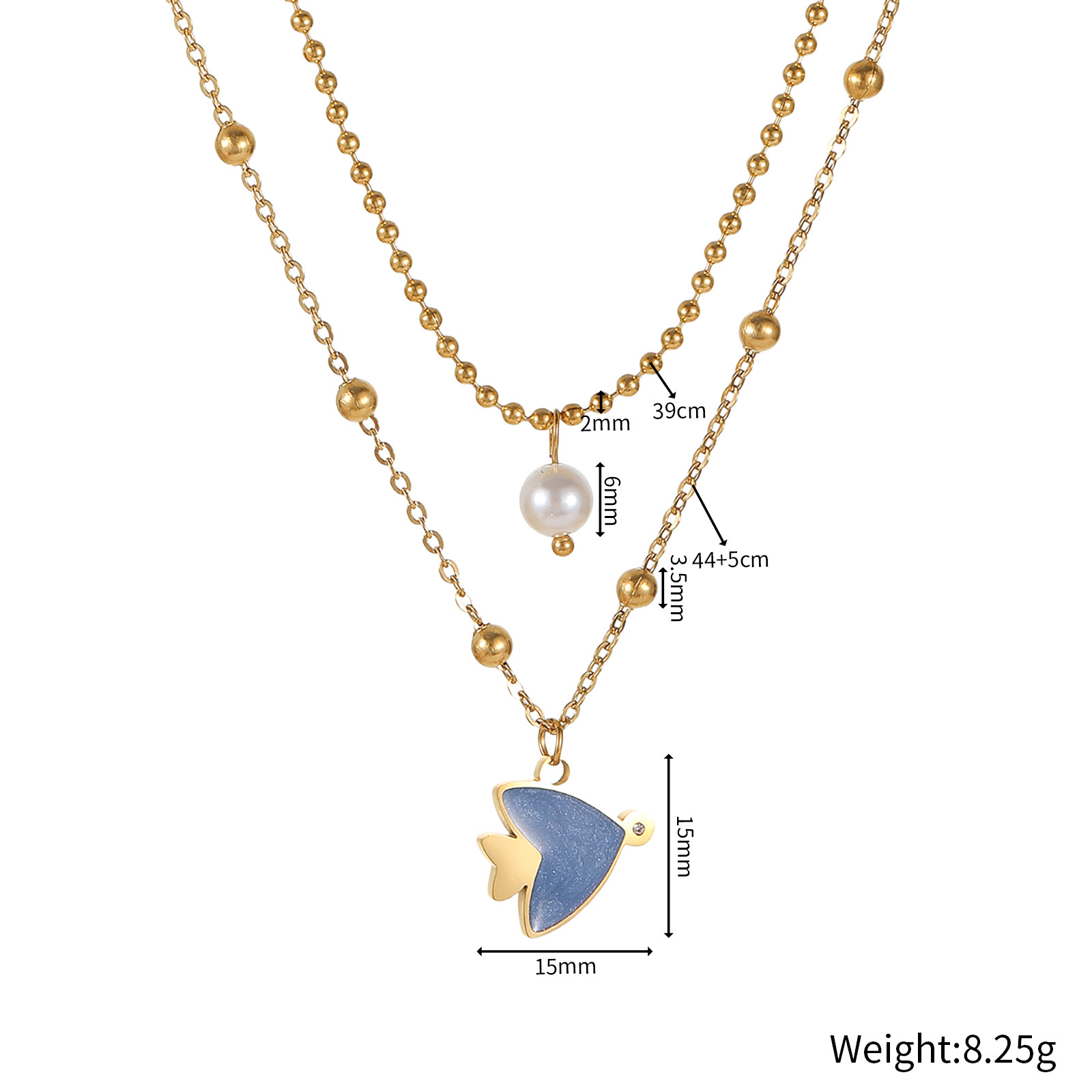 贝壳珍珠双层项链 :波珠链长39cm,宽2mm,04十字夹3.5mm珠链长44+5cm,鱼15.5x15mm,珍珠6mm