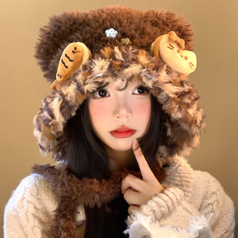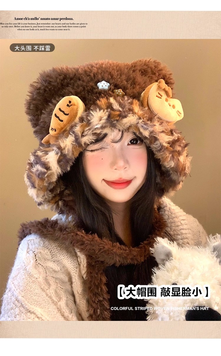 可爱咖色小熊耳朵小鱼毛绒护耳帽女冬显脸小保暖防寒针织雷锋帽子
