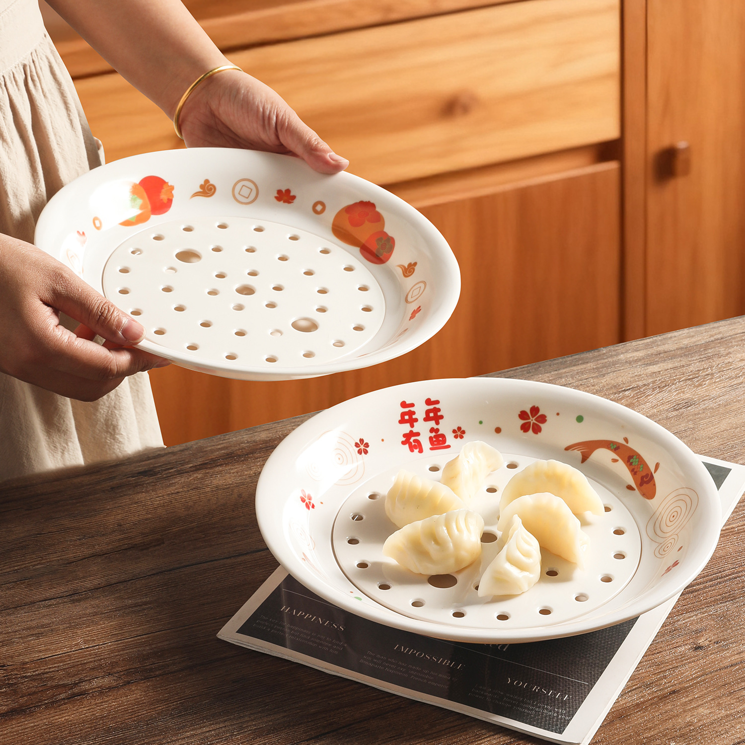 陶瓷圆形釉下彩沥水饺子盘家用白色盘子寸餐具菜盘多孔蒸盘