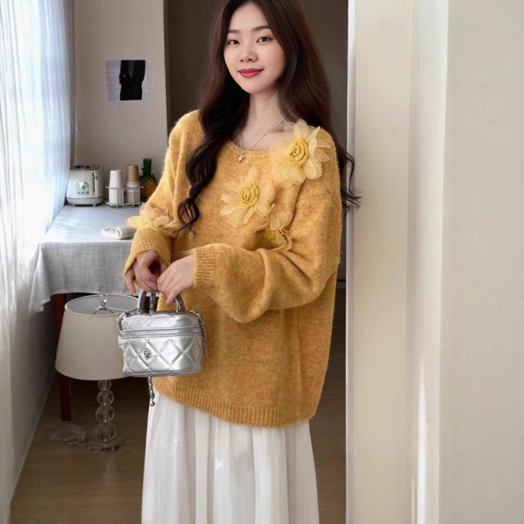 实拍大码女装2025秋冬新款立体花朵毛衣针织衫慵懒风圆领套头毛衣