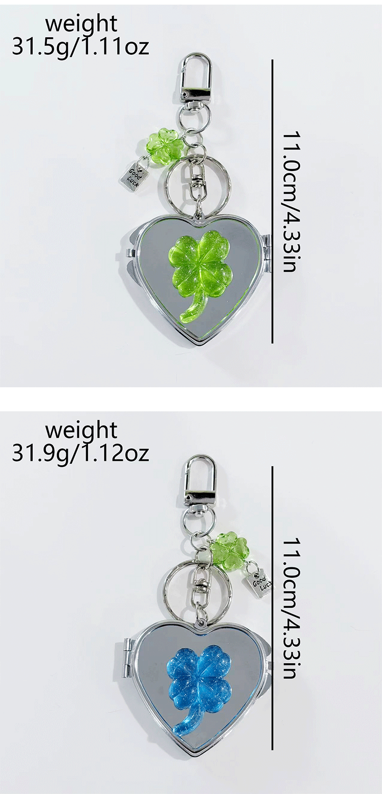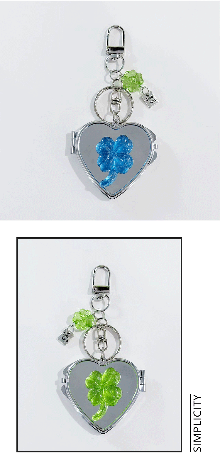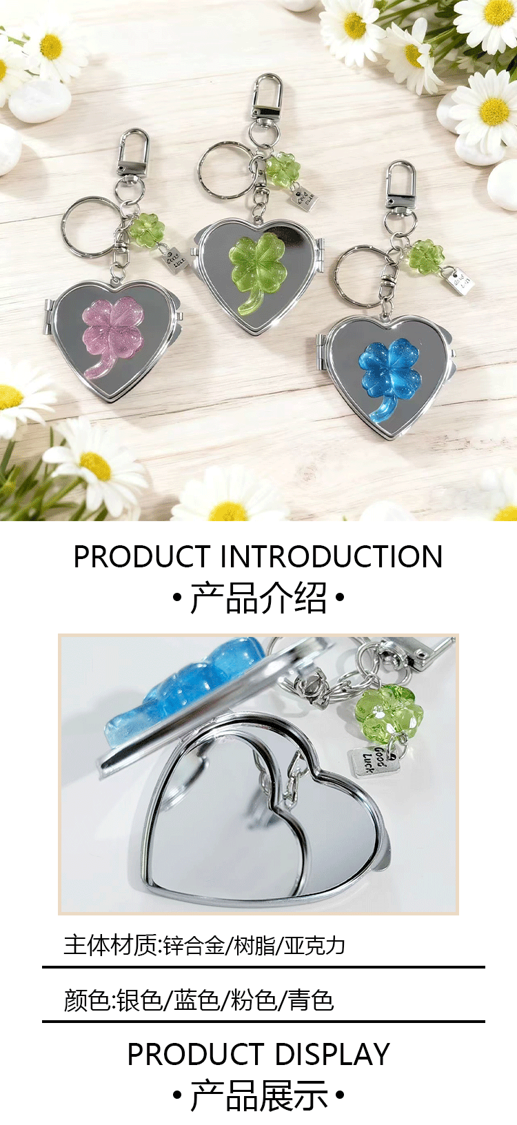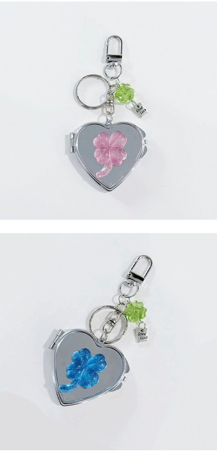 ins精致百搭田园风多色细闪四叶草可打开爱心镜子钥匙扣包包挂件