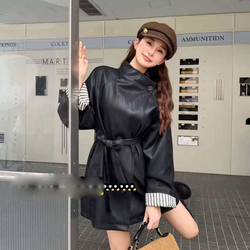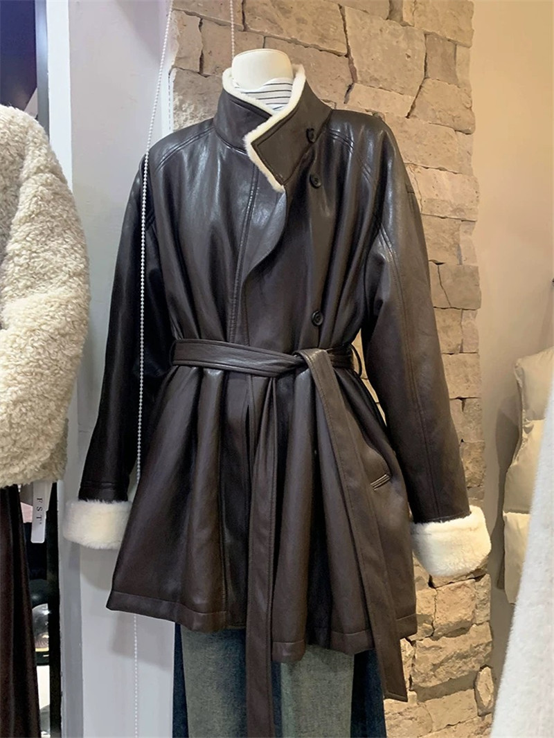 秋冬加厚款皮衣外套女咖色pu皮时尚宽松系带中长款韩版收腰宽松