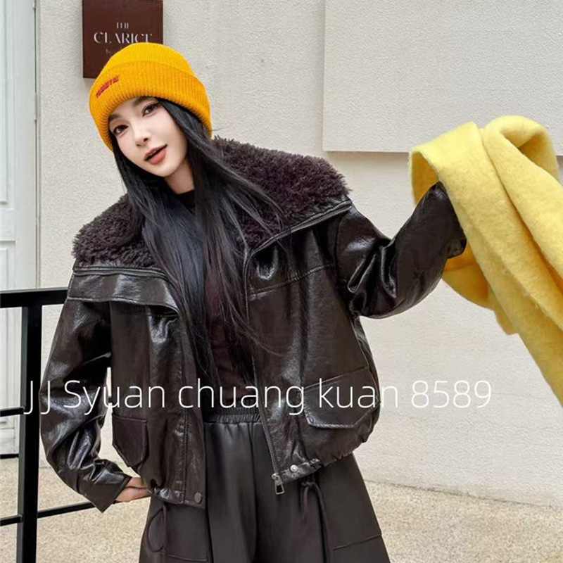 加绒加厚短款皮衣女2025冬季新款复古显瘦机车羊羔毛领皮棉衣外套