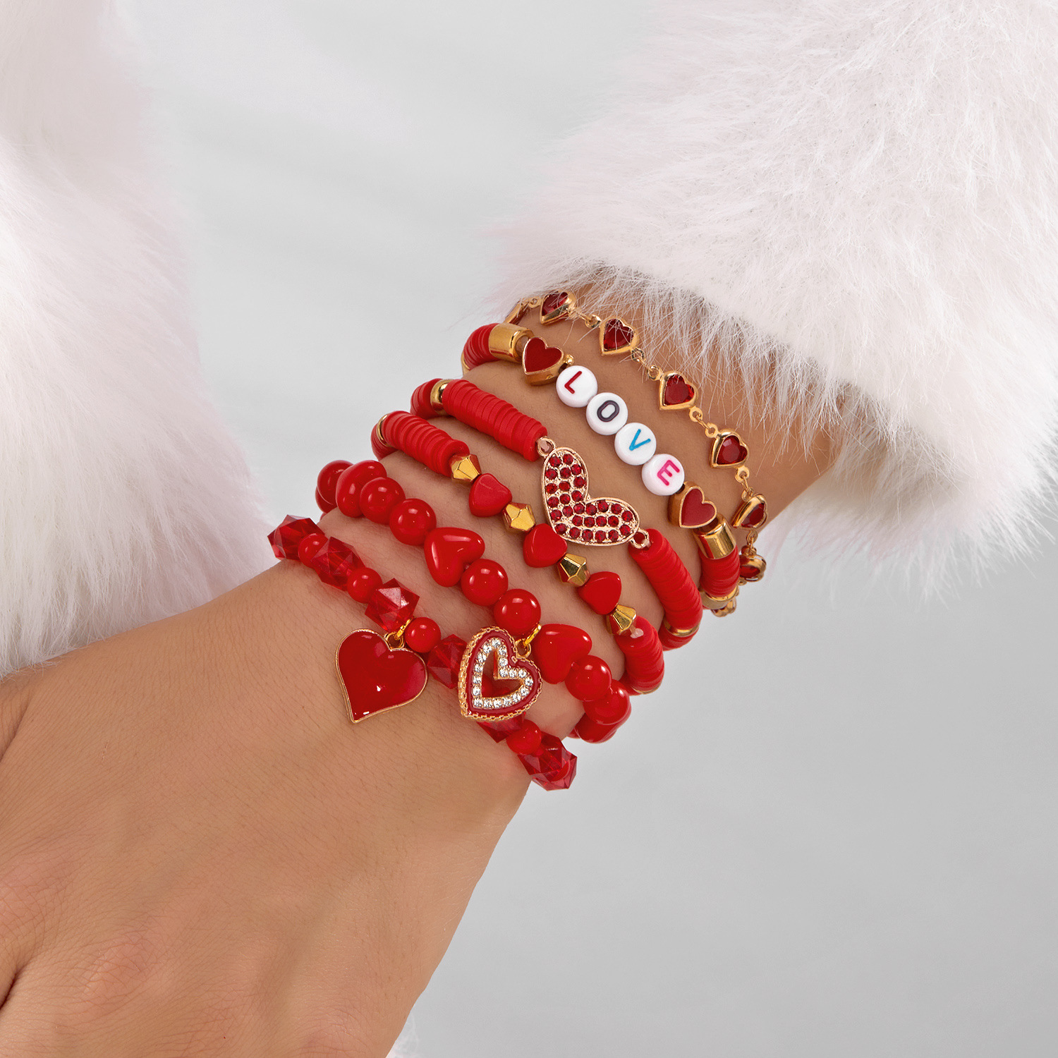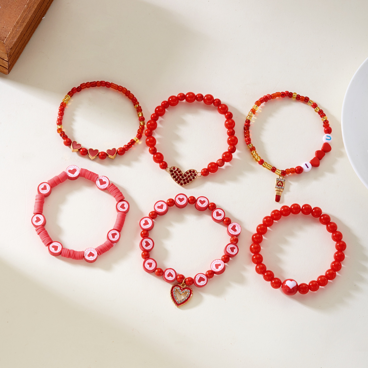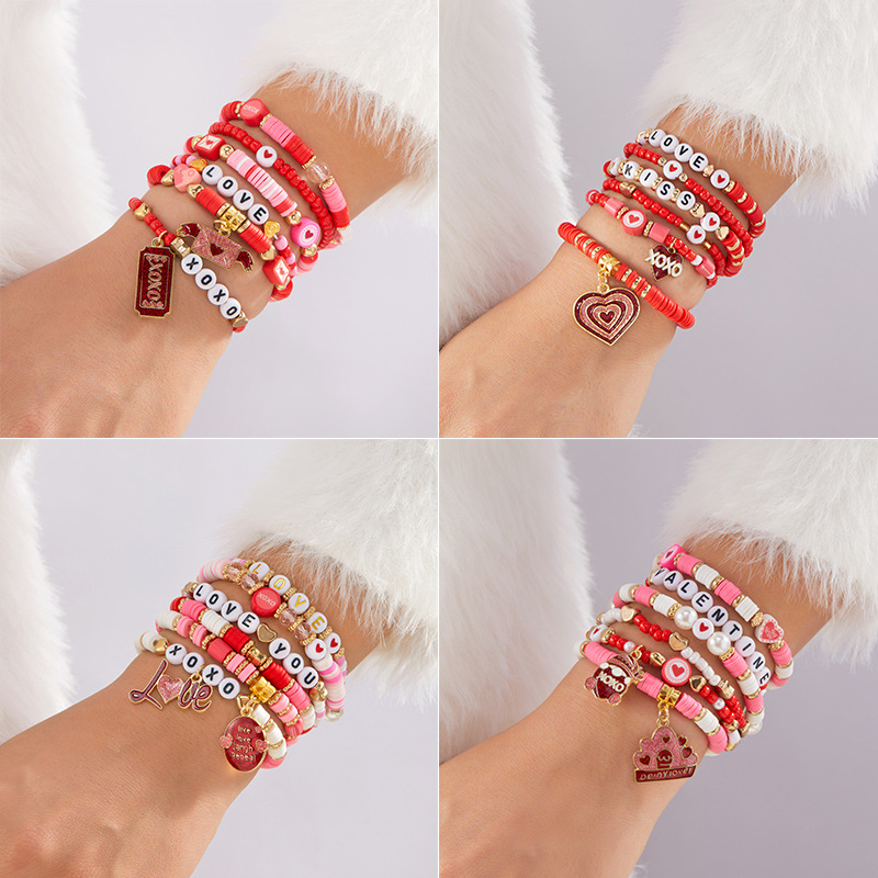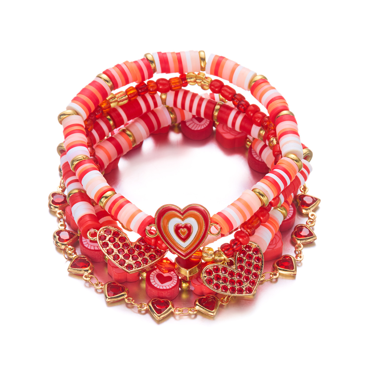 跨境热销情人节爱心手链套装女生时尚饰品软陶串珠桃心红色系手链