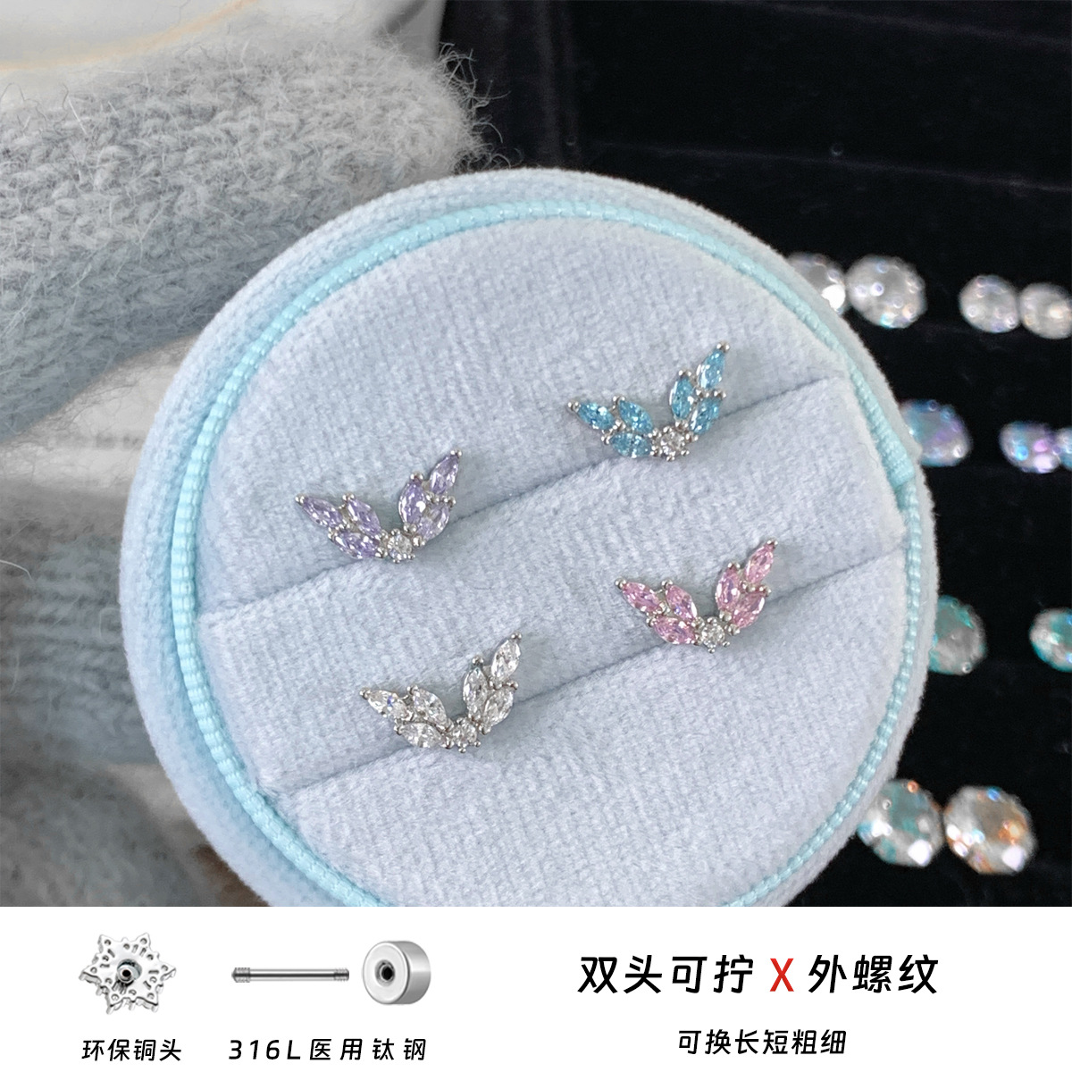 316L医用钛钢耳钉甜酷彩色锆石天使之翼翅膀耳骨钉耳蜗钉耳饰