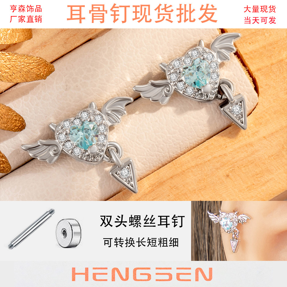316L医用钛钢耳钉甜酷浅海蓝爱心锆石耳钉养耳洞小恶魔翅膀耳骨钉