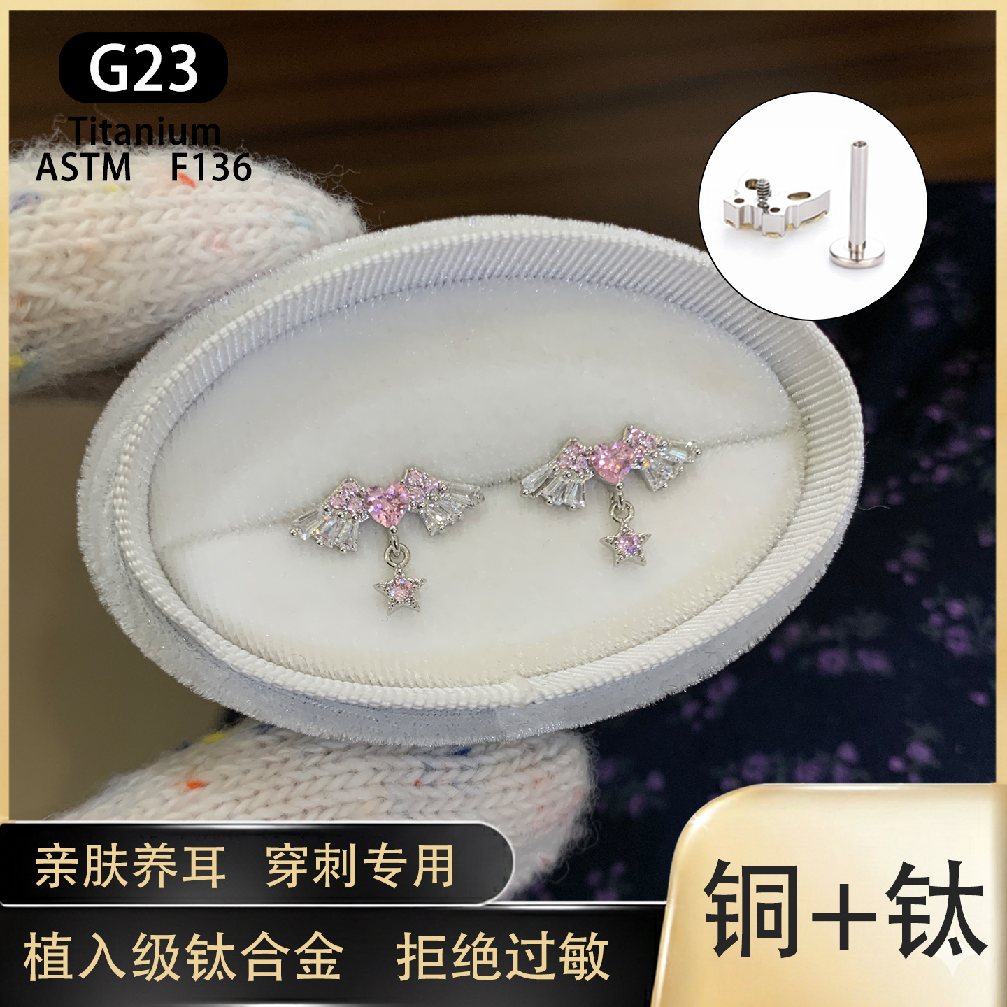 1.2粗G23钛合金粉锆爱心大翅膀耳骨钉内螺纹耳钉养耳洞穿刺耳饰